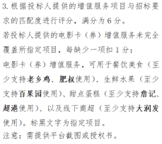 *.根据补疑*文件第二部分:招标文件澄清部分“电影兑换券使用范围 *.“电影卡(券)增值服务需覆盖餐饮美食(至少支持老乡鸡、肥叔使用)、生鲜水果(至少支持百果园使用)、甜点蛋糕(至少支持詹记、超港使用)、线下商超(至少支持大润发使用),标黑文字为指定项目,注意:需提供平台截图或授权书”。