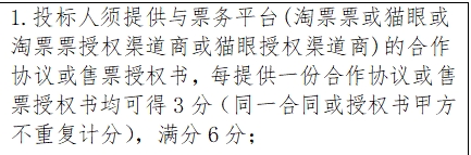 *.投标人须提供与票务平台(淘票票或猫眼或淘票票授权渠道商或猫眼授权渠道商)的合作协议或售票授权书,每提供一份合作协议或售票授权书均可得*分(同一合同或授权书甲方不重复计分),满分*分;