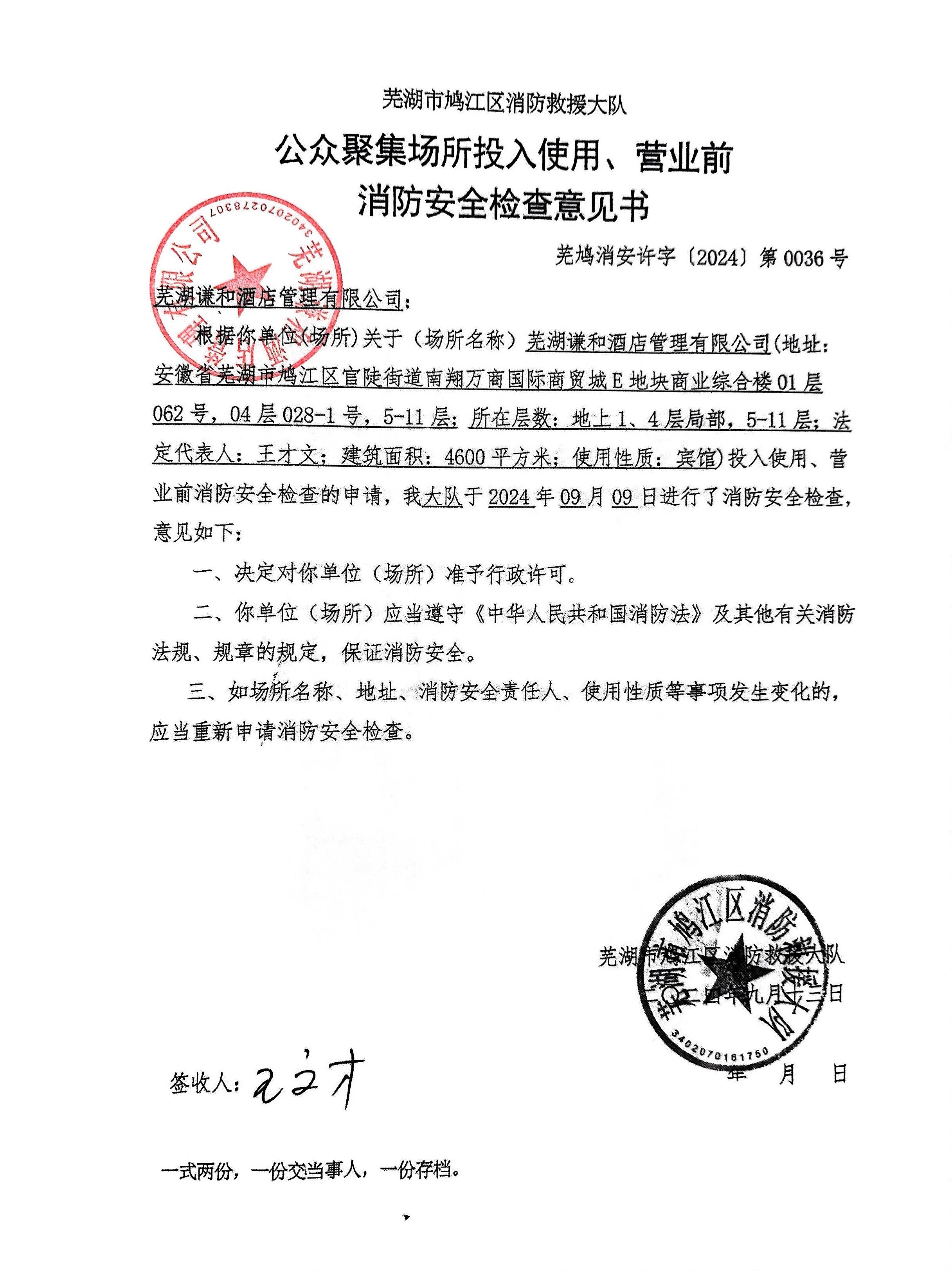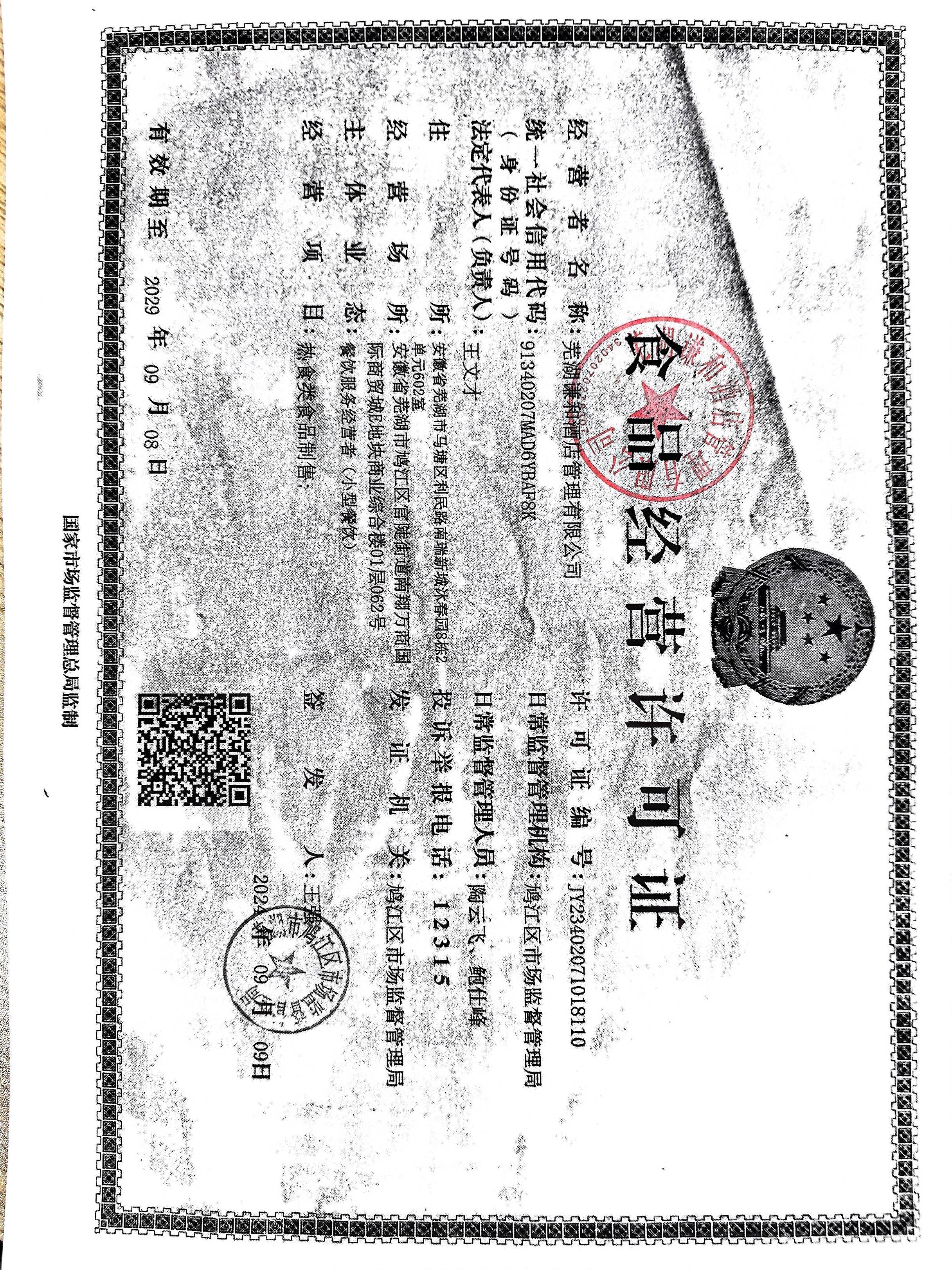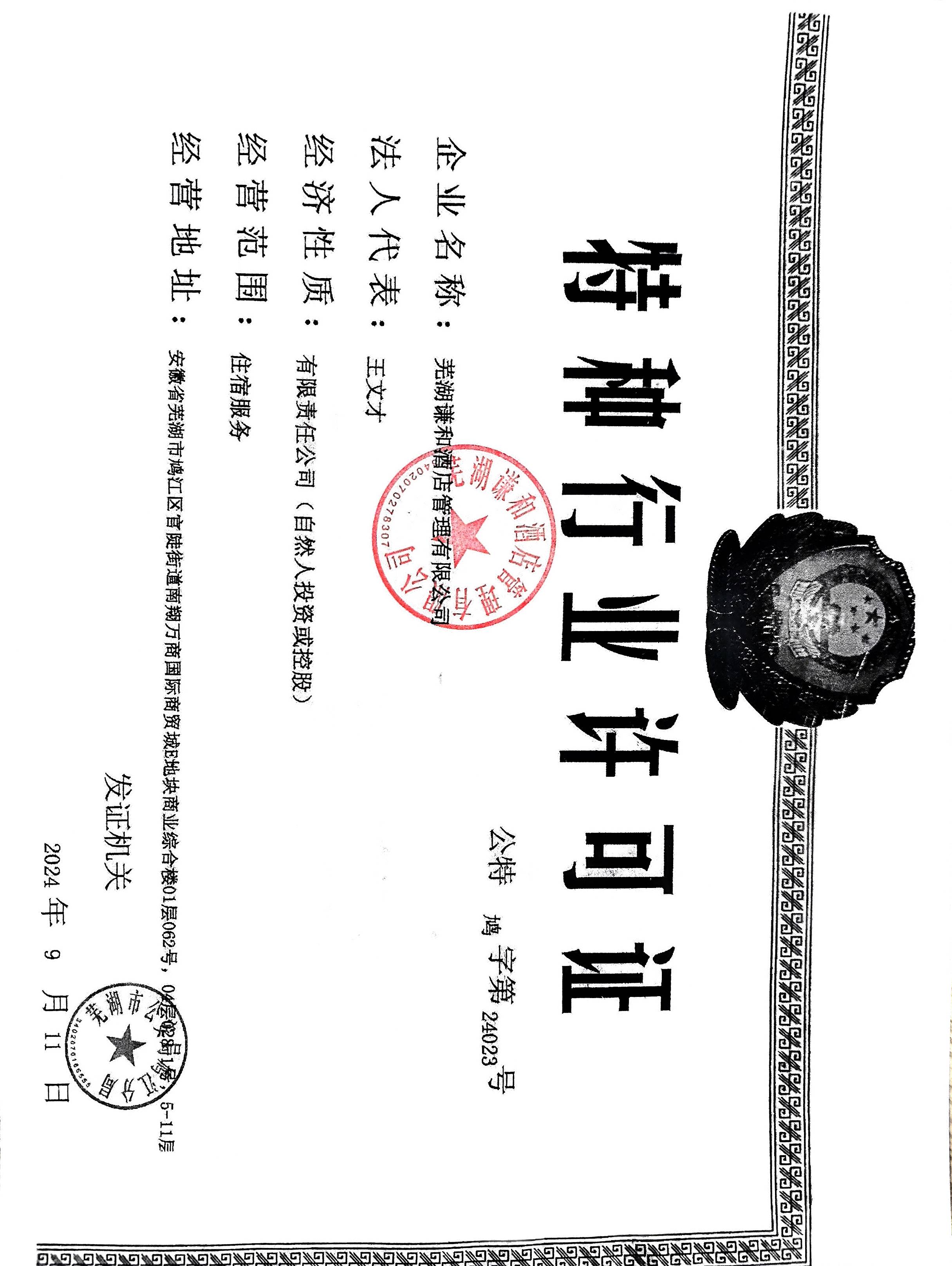 供应商名称:芜湖谦和酒店管理有限公司