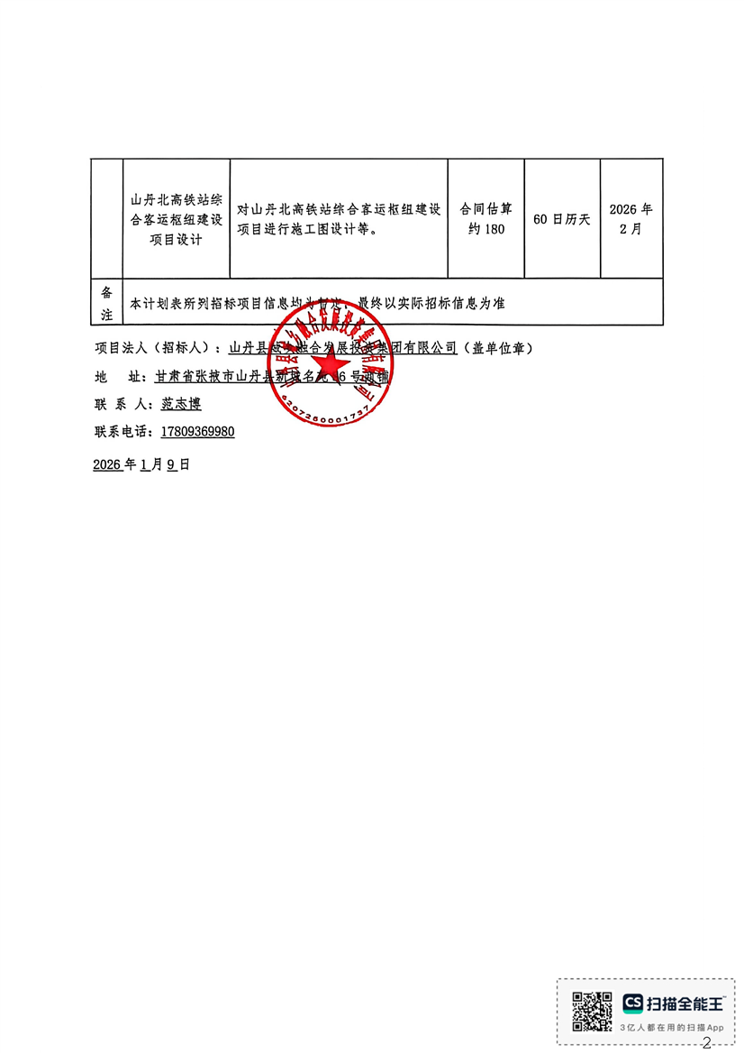 山丹北高铁站综合客运枢纽建设项目招标计划