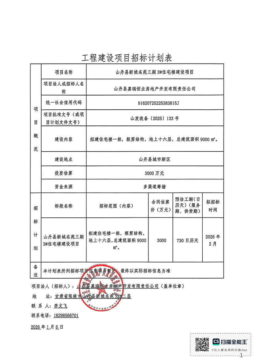 山丹县新城名苑三期3#住宅楼建设项目招标计划
