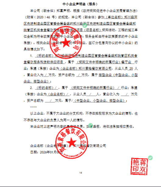 郑州经开区先进制造业园区管委会筹备组郑姚管区机关食堂餐饮服务和货物供应项目*成交公告