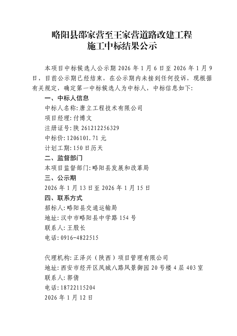 略阳县邵家营至王家营道路改建工程施工中标结果公示