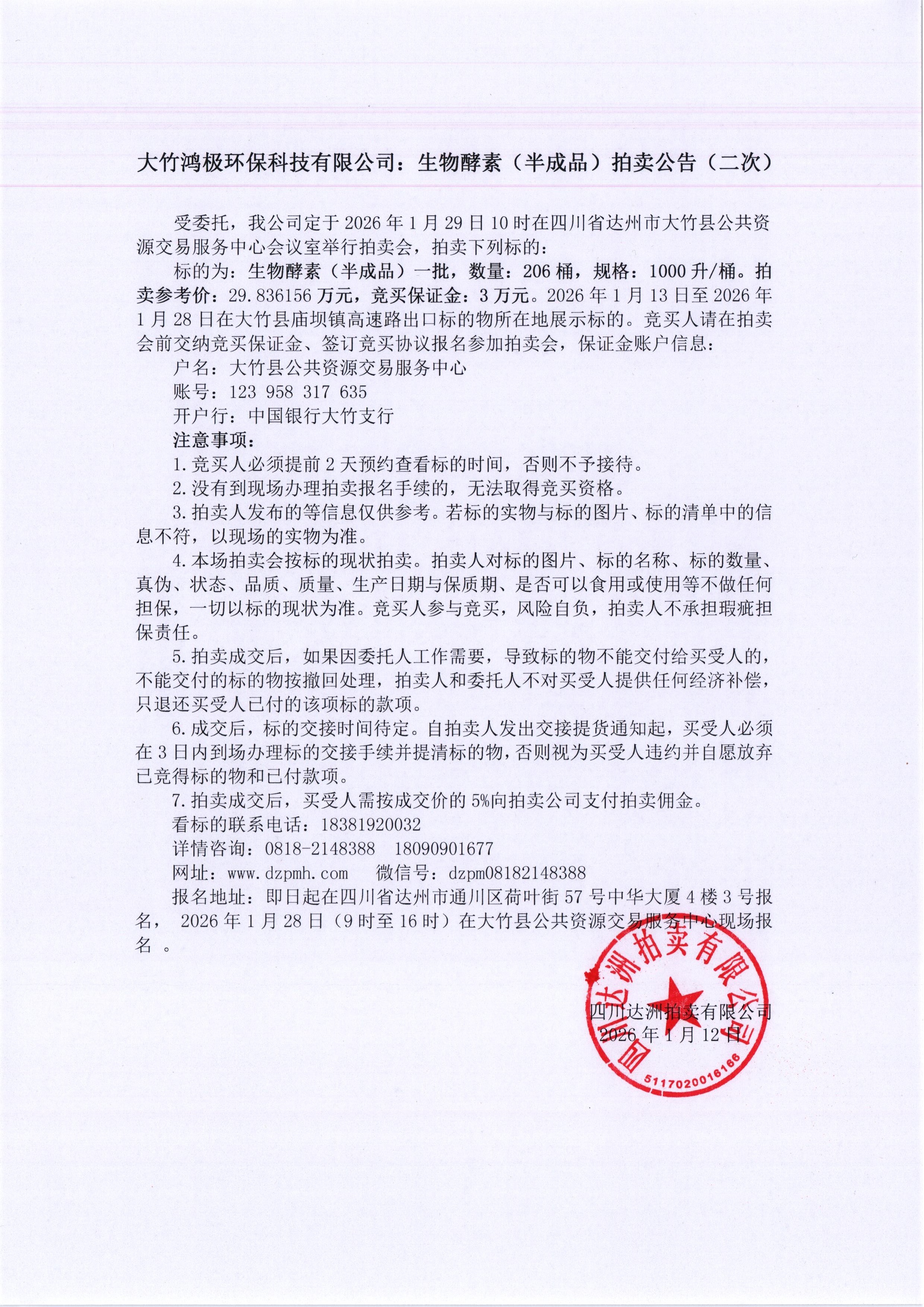 大竹鸿极环保科技有限公司:生物酵素(半成品)拍卖公告(二次)