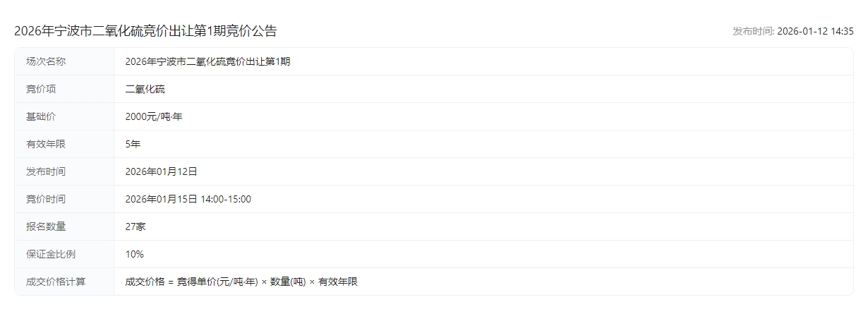 2026年宁波市二氧化硫竞价出让第1期竞价公告交易公告