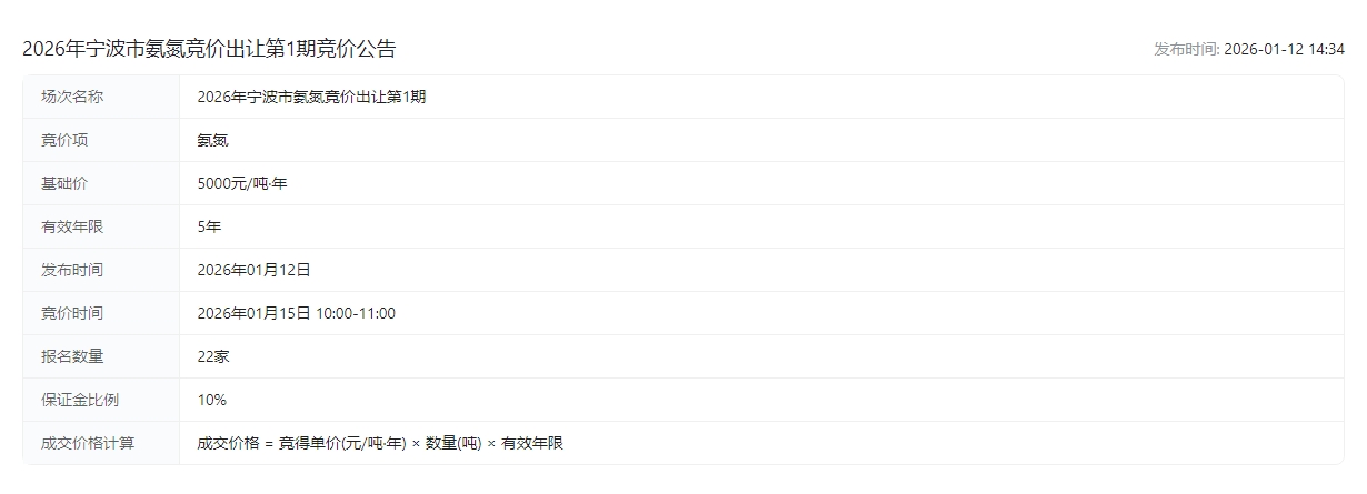 2026年宁波市氨氮竞价出让第1期竞价公告交易公告