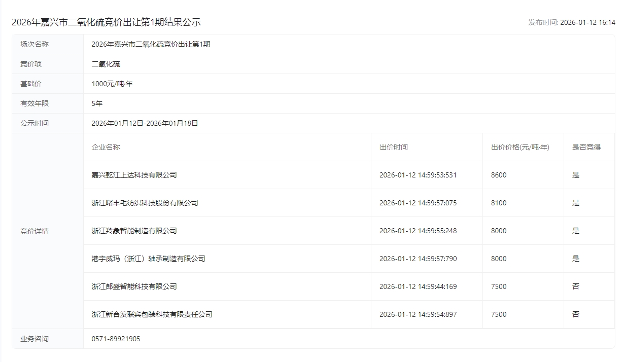 2026年嘉兴市二氧化硫竞价出让第1期结果公示