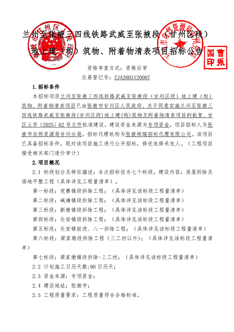 兰州至张掖三四线铁路武威至张掖段(甘州区段)地上建(构)筑物、附着物清表项目招标/资审公告