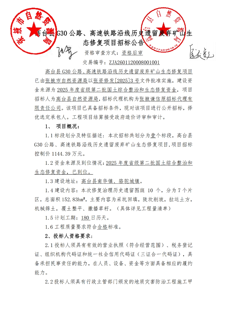 高台县G30公路、高速铁路沿线历史遗留废弃矿山生态修复项目公开招标公告