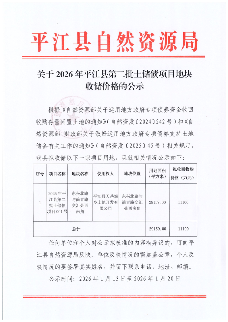 关于平江县2026年第二批土储债项目地块收储价格的公示(001号)