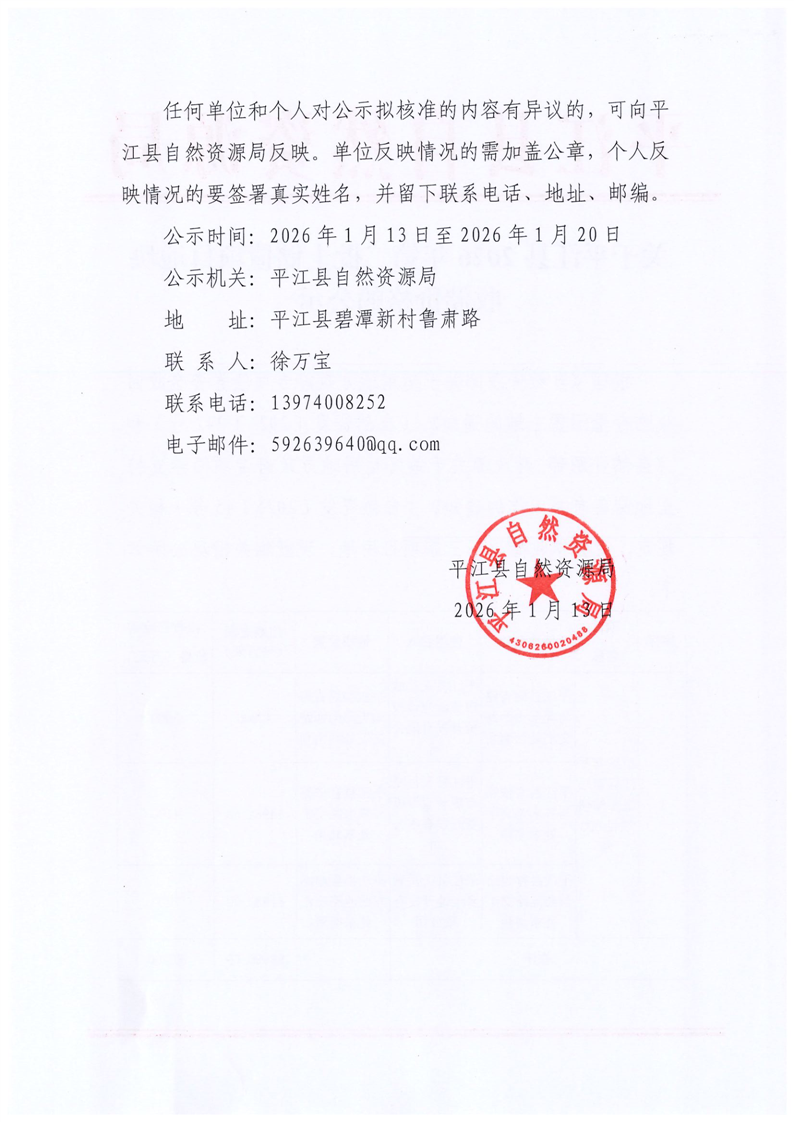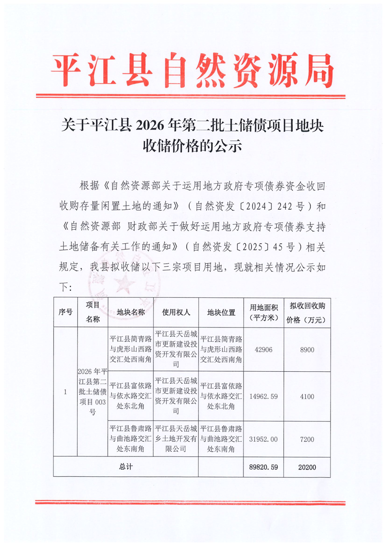 关于平江县2026年第二批土储债项目地块收储价格的公示(003号)