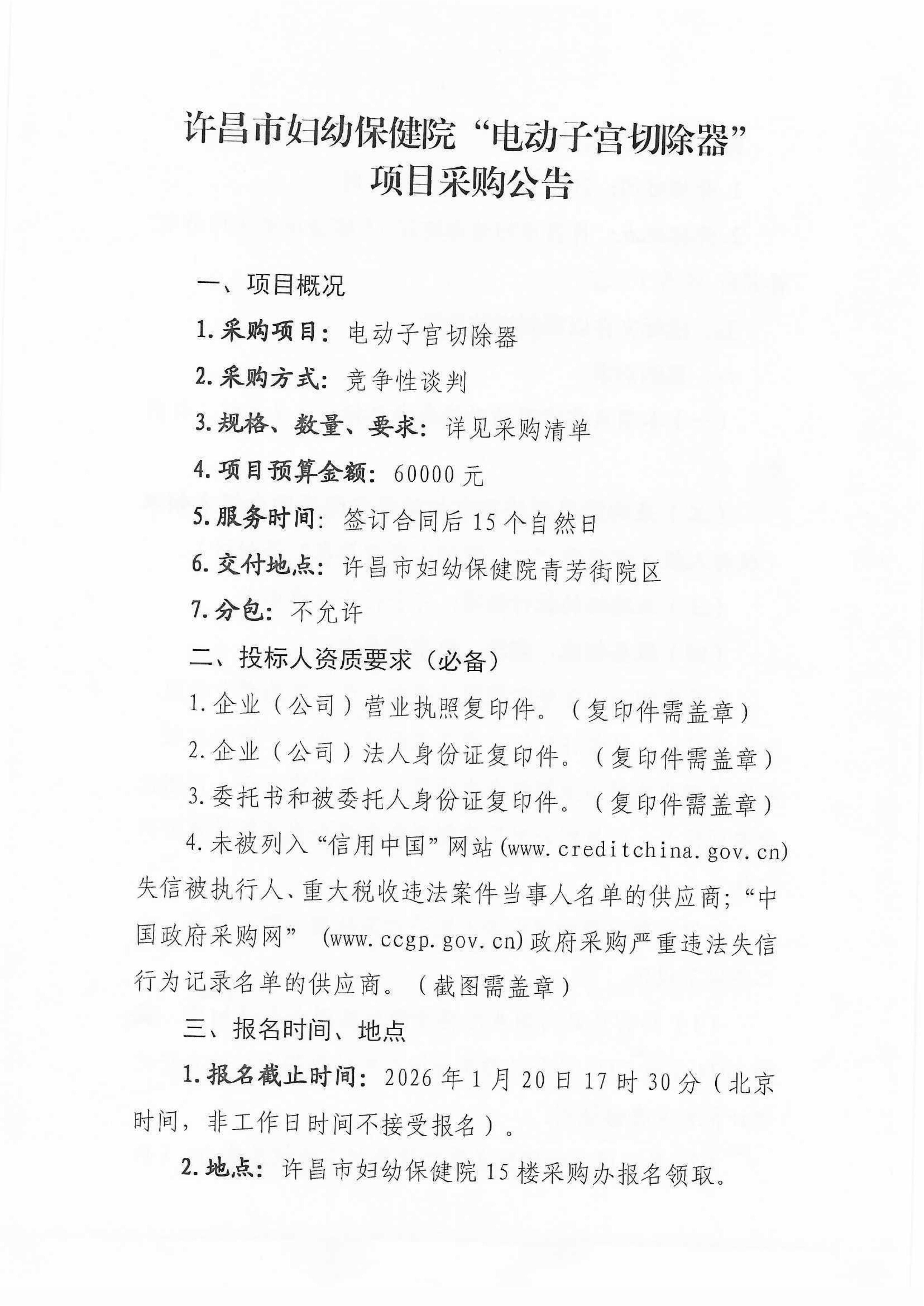 许昌市妇幼保健院“电动子宫切除器”项目采购公告