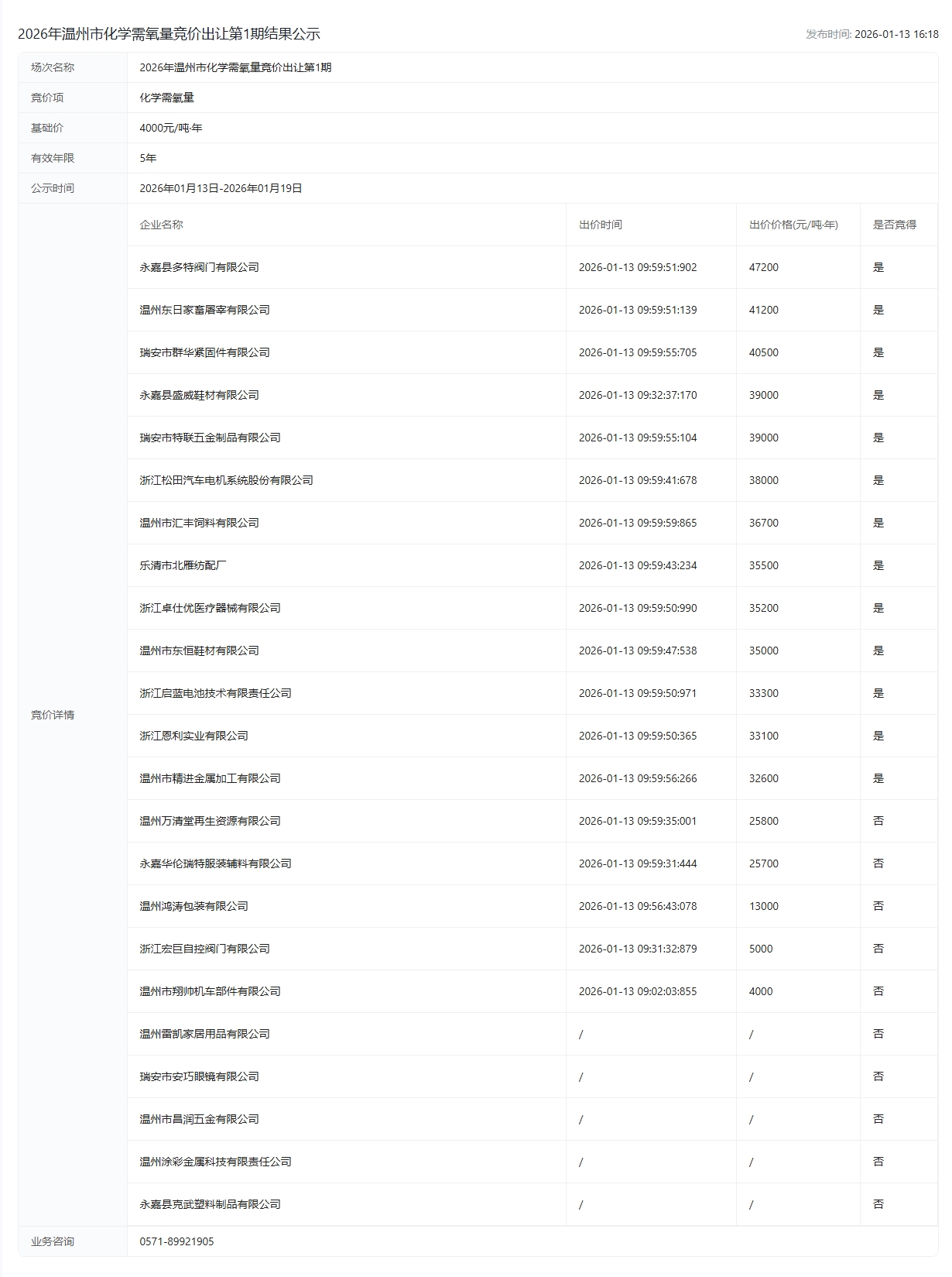 2026年温州市化学需氧量竞价出让第1期结果公示