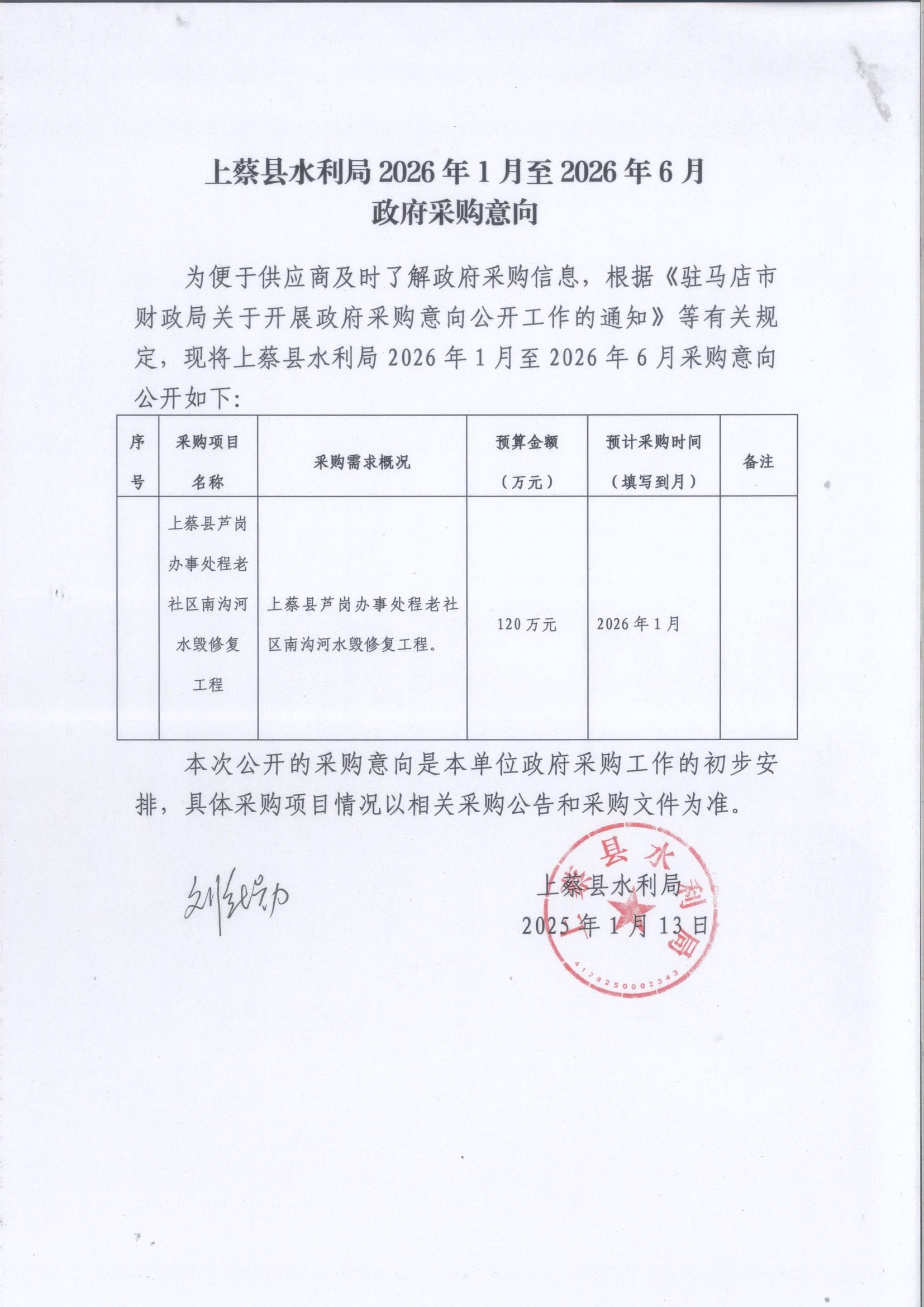 上蔡县水利局2026年1至6月政府采购意向