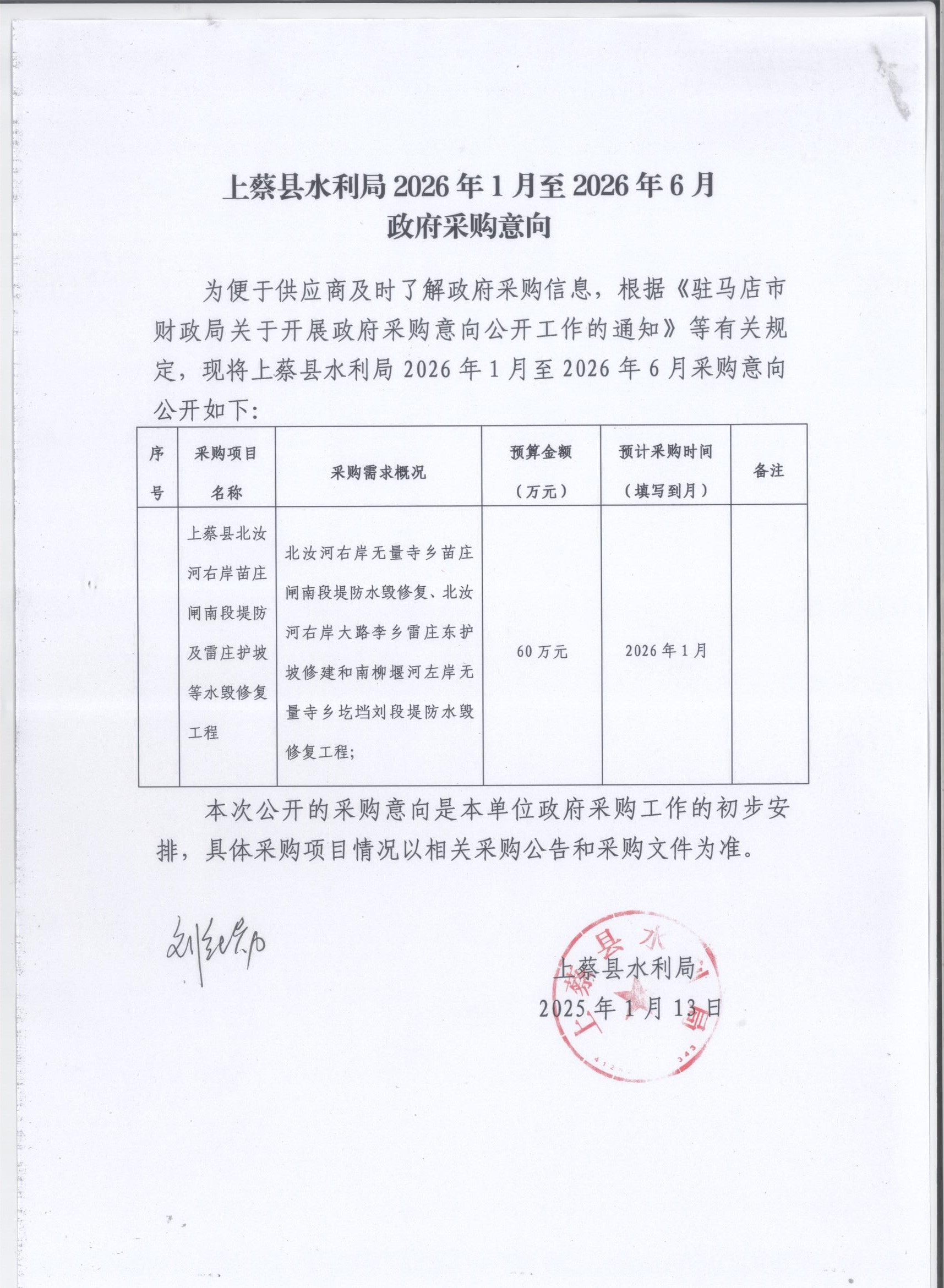上蔡县水利局2026年1至6月政府采购意向