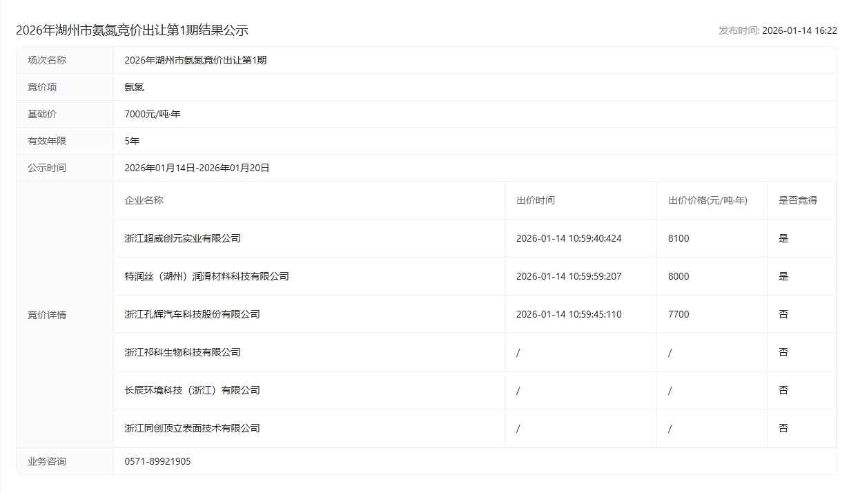 2026年湖州市氨氮竞价出让第1期结果公示