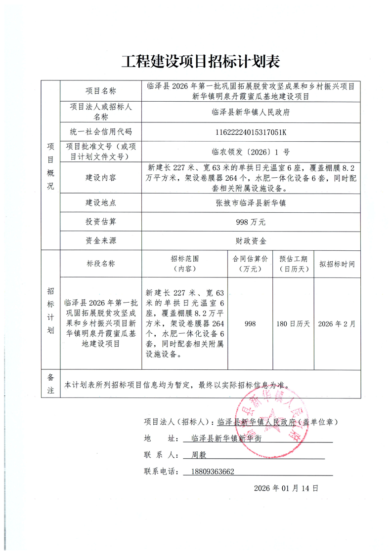 临泽县2026年第一批巩固拓展脱贫攻坚成果和乡村振兴项目新华镇明泉丹霞蜜瓜基地建设项目招标计划