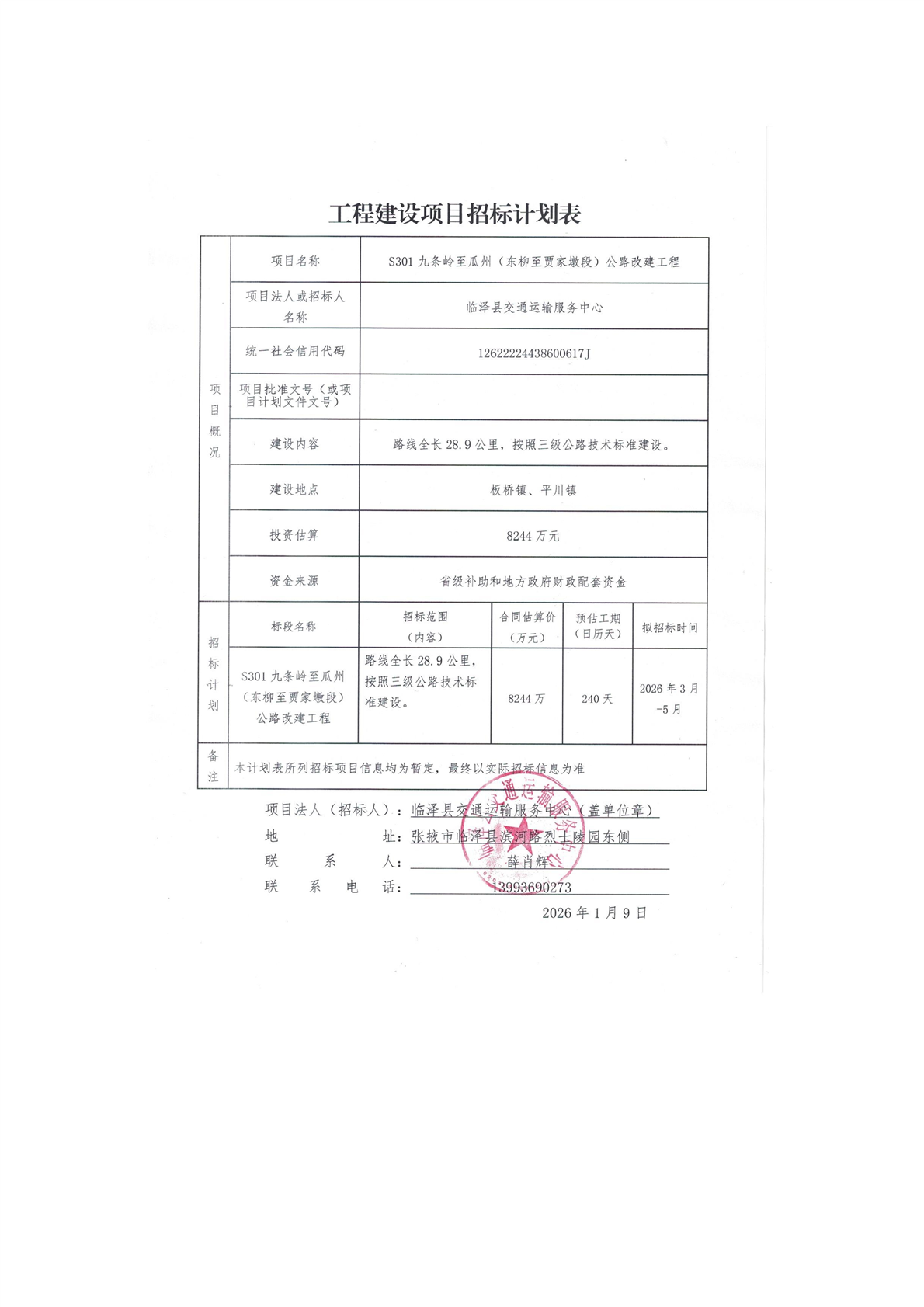 S301九条岭至瓜州(东柳至贾家墩段)公路改建工程招标计划