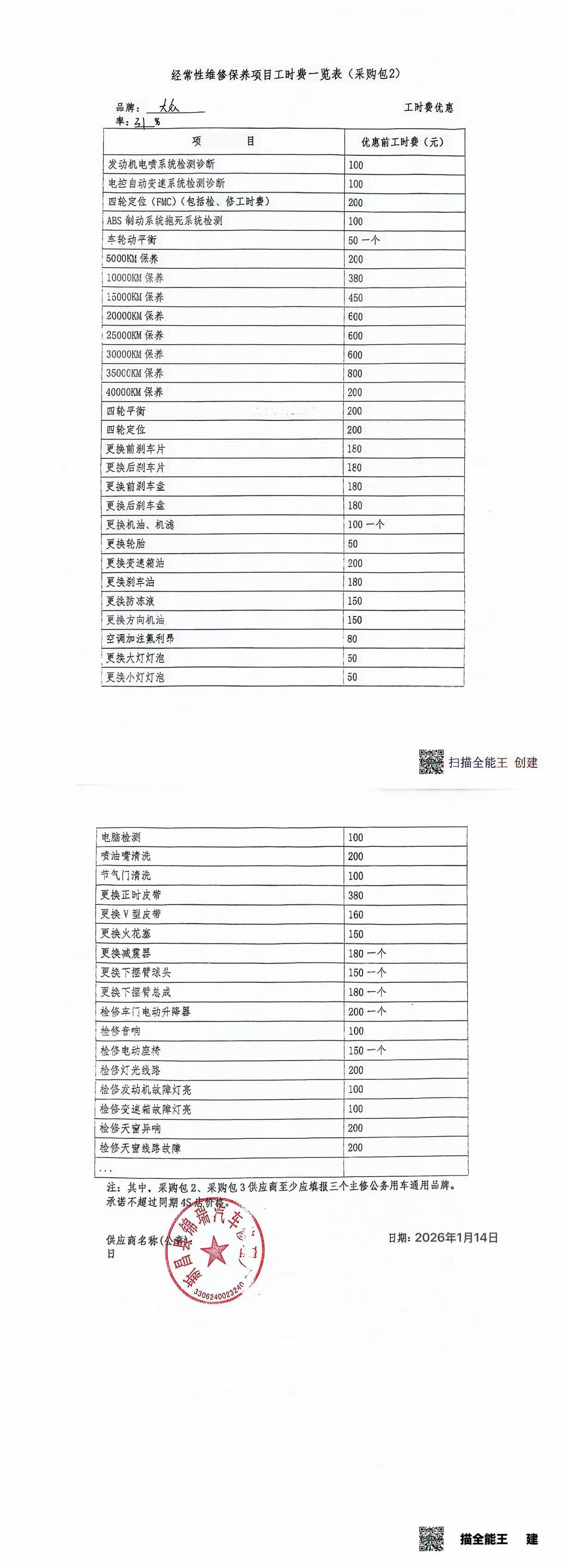 经常性维修保养项目工时费览表:大众.***