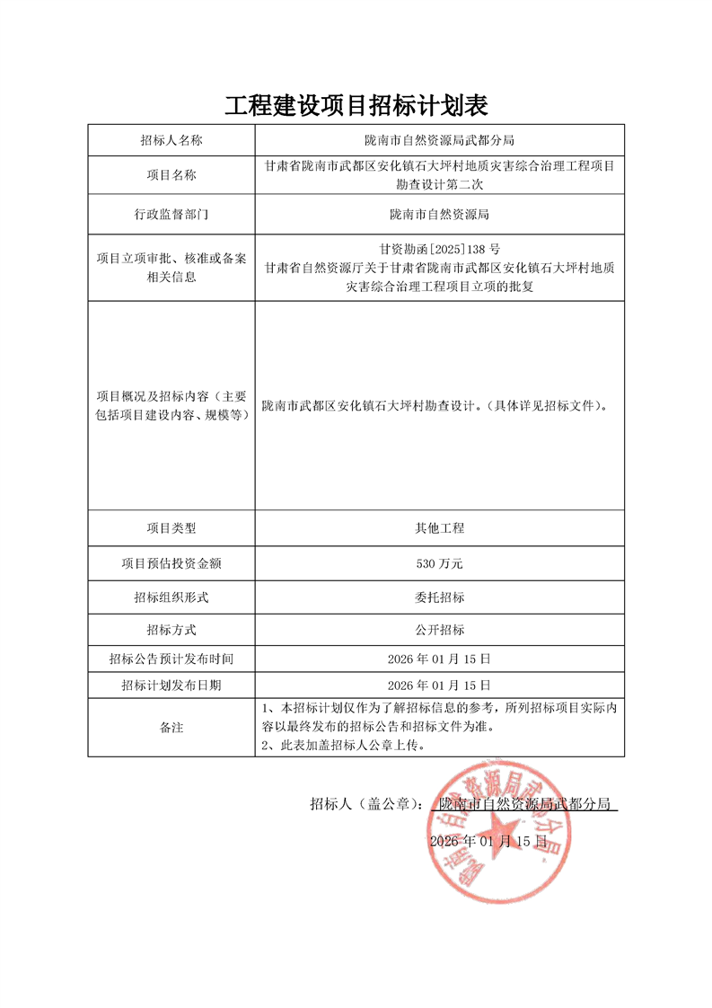 甘肃省陇南市武都区安化镇石大坪村地质灾害综合治理工程项目勘查设计第二次