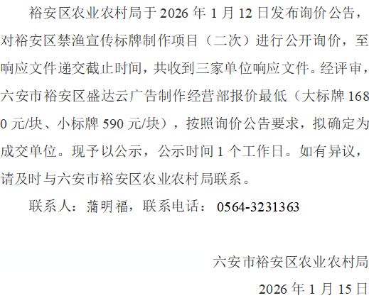 裕安区禁渔宣传标牌制作项目(二次)询价成交结果的公示