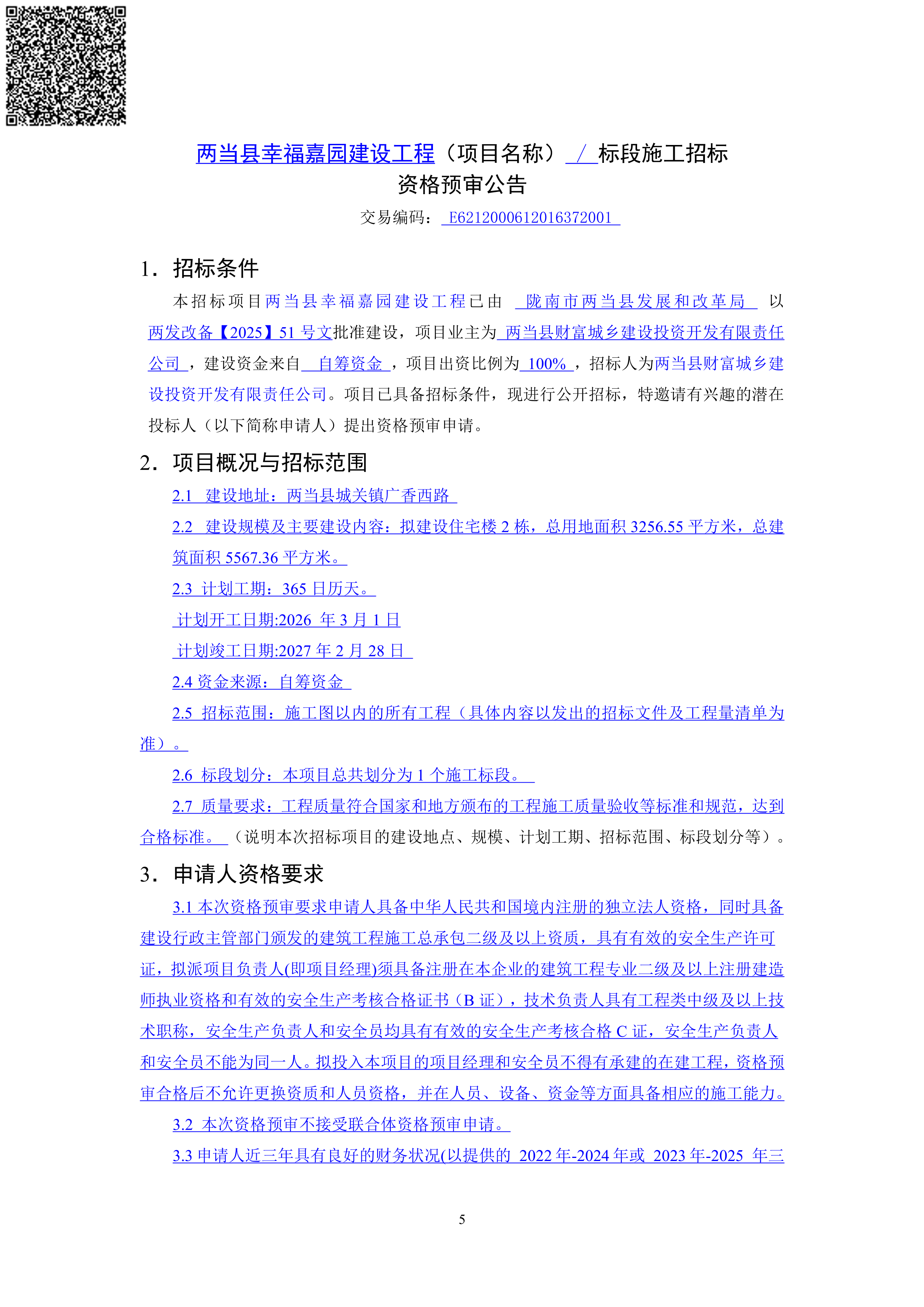 两当县幸福嘉园建设工程施工招标资格预审公告招标/资审公告
