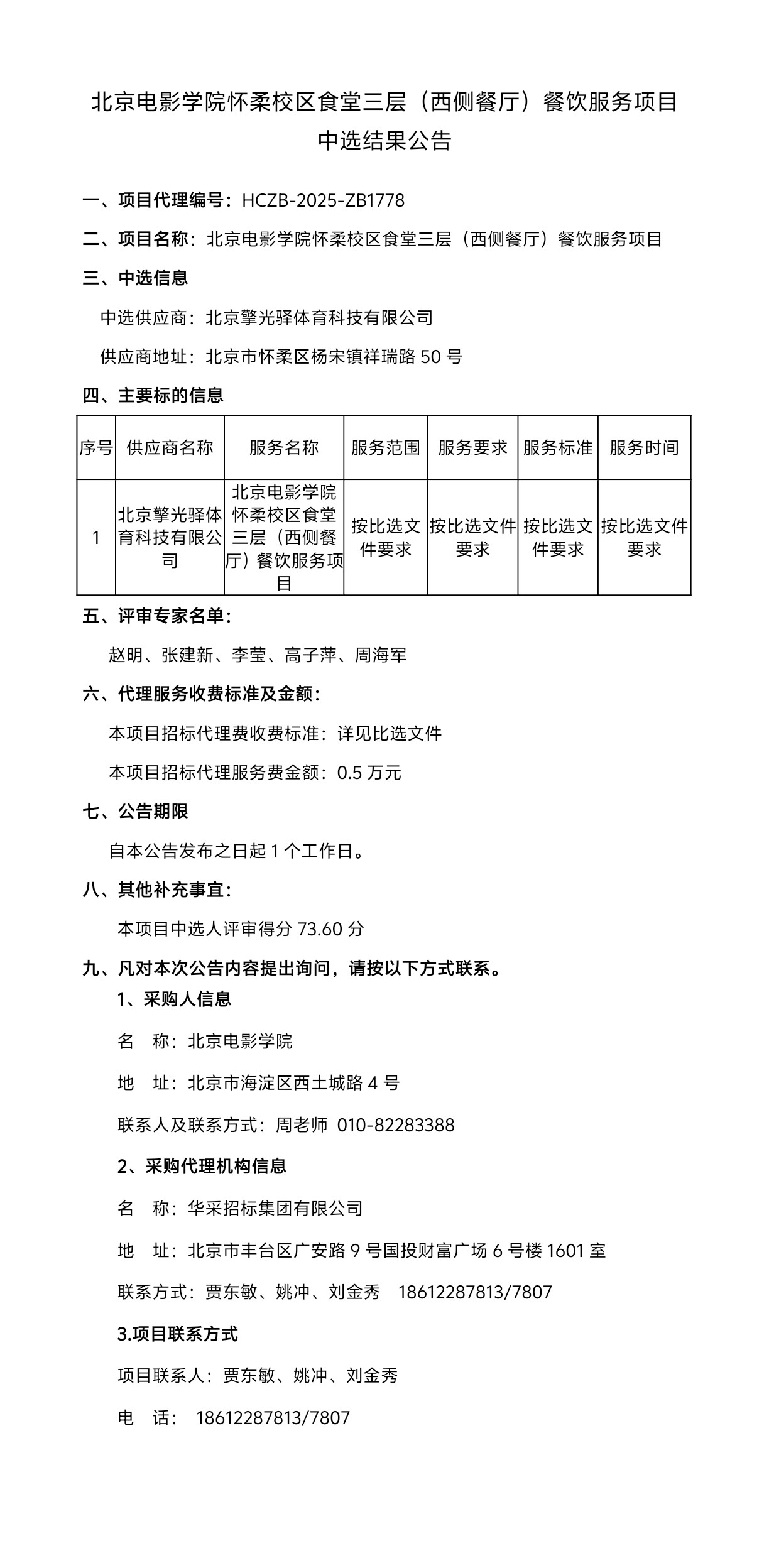 北京电影学院怀柔校区食堂三层(西侧餐厅)餐饮服务项目中选结果公告