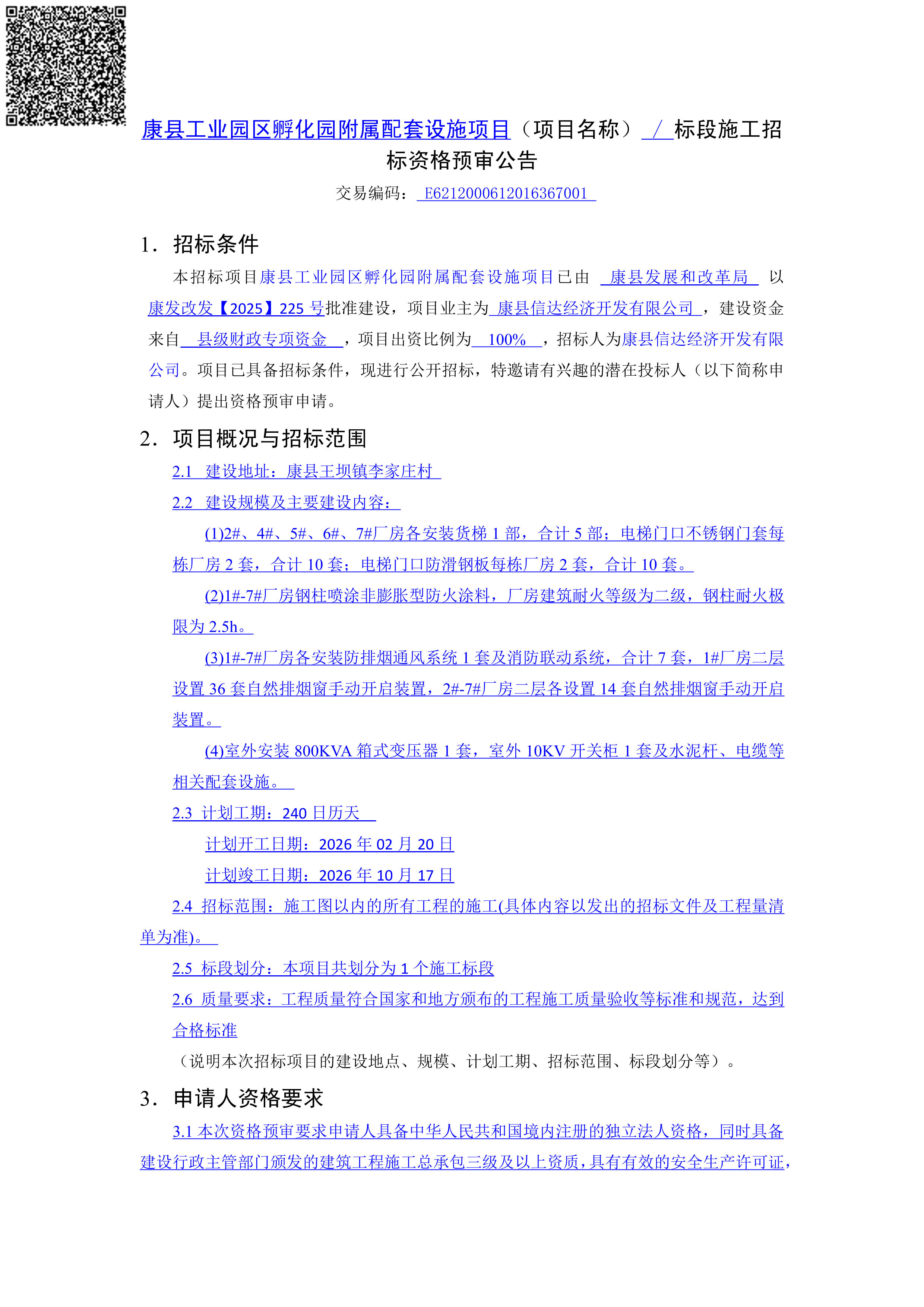 康县工业园区孵化园附属配套设施项目施工招标资格预审公告招标/资审公告