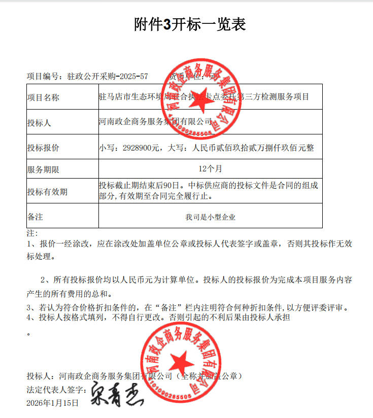 | *、经采购人确认:河南政企商务服务集团有限公司为中标供应商,最终评审总得分为**.**分。 *、各相关当事人对中标公告有异议的,可在中标公告发布之日起七个工作日内,以书面形式向采购人和采购代理机构提出质疑(加盖单位公章且法人签字),并以质疑函接受确认日期作为受理时间。逾期提交或未按要求提出的质疑函将不予受理。 | |||||||||||||||||||||||||||||||
