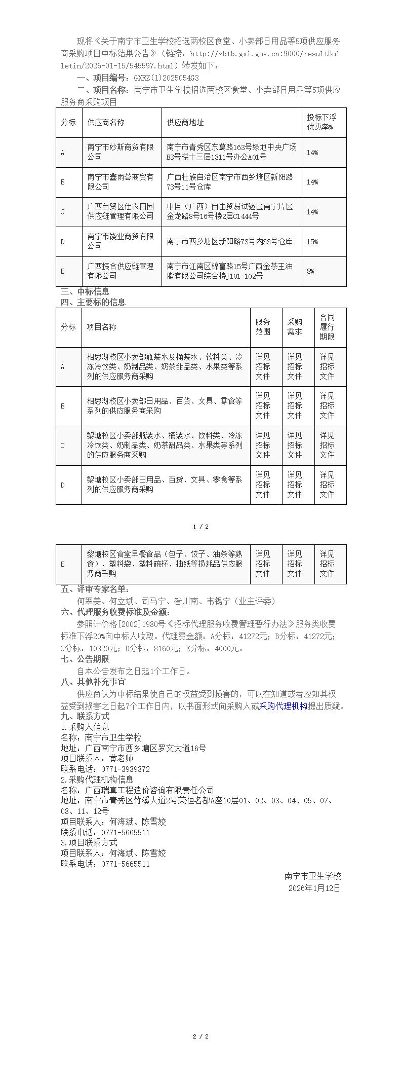 关于关于南宁市卫生学校招选两校区食堂、小卖部日用品等5项供应服务商采购项目中标结果公告