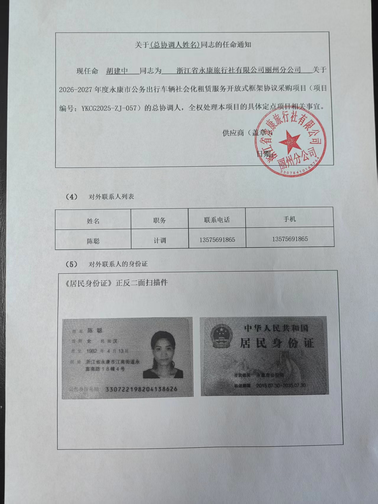 浙江省永康旅行社有限公司丽州分公司入围2026-2027年度永康市公务出行车辆社会化租赁服务开放式框架协议采购项目的结果公告