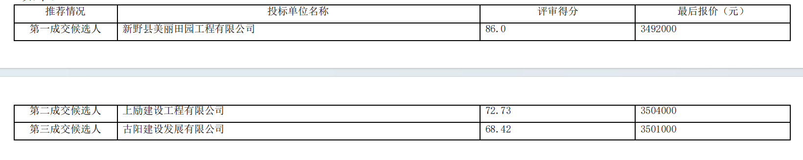 | (*)本项目无供应商未通过资格审查和符合性审查。(*)未成交供应商得分及排序:第*名:上励建设工程有限公司,得分**.**分,第*名:古阳建设发展有限公司,得分**.**分。(*)各有关当事人对中标结果有异议的,可以在评标结果公告发布之日起七个工作日内,以书面形式同时向采购人和采购代理机构提出质疑(法人签字盖章并加盖单位公章),由法定代表人或其授权代表携带本人身份证件(原件)一并提交(邮寄、传真件不予受理)。逾期未提交或未按照要求提交的质疑函将不予受理。 | |||||||||||||||||||||||||||||||