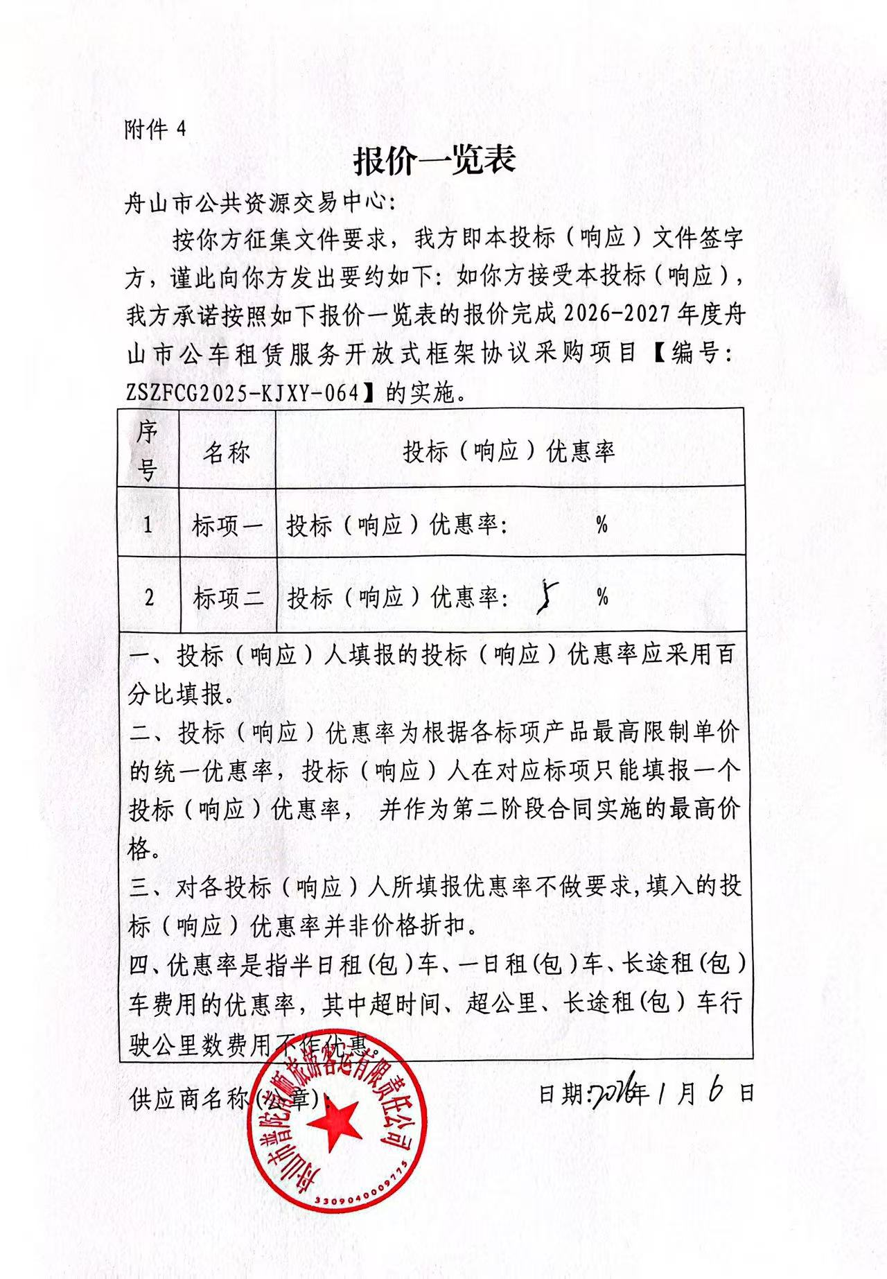 舟山市普陀南顺旅游客运有限责任公司入围2026-2027年度舟山市公车租赁服务开放式框架协议采购项目的结果公告