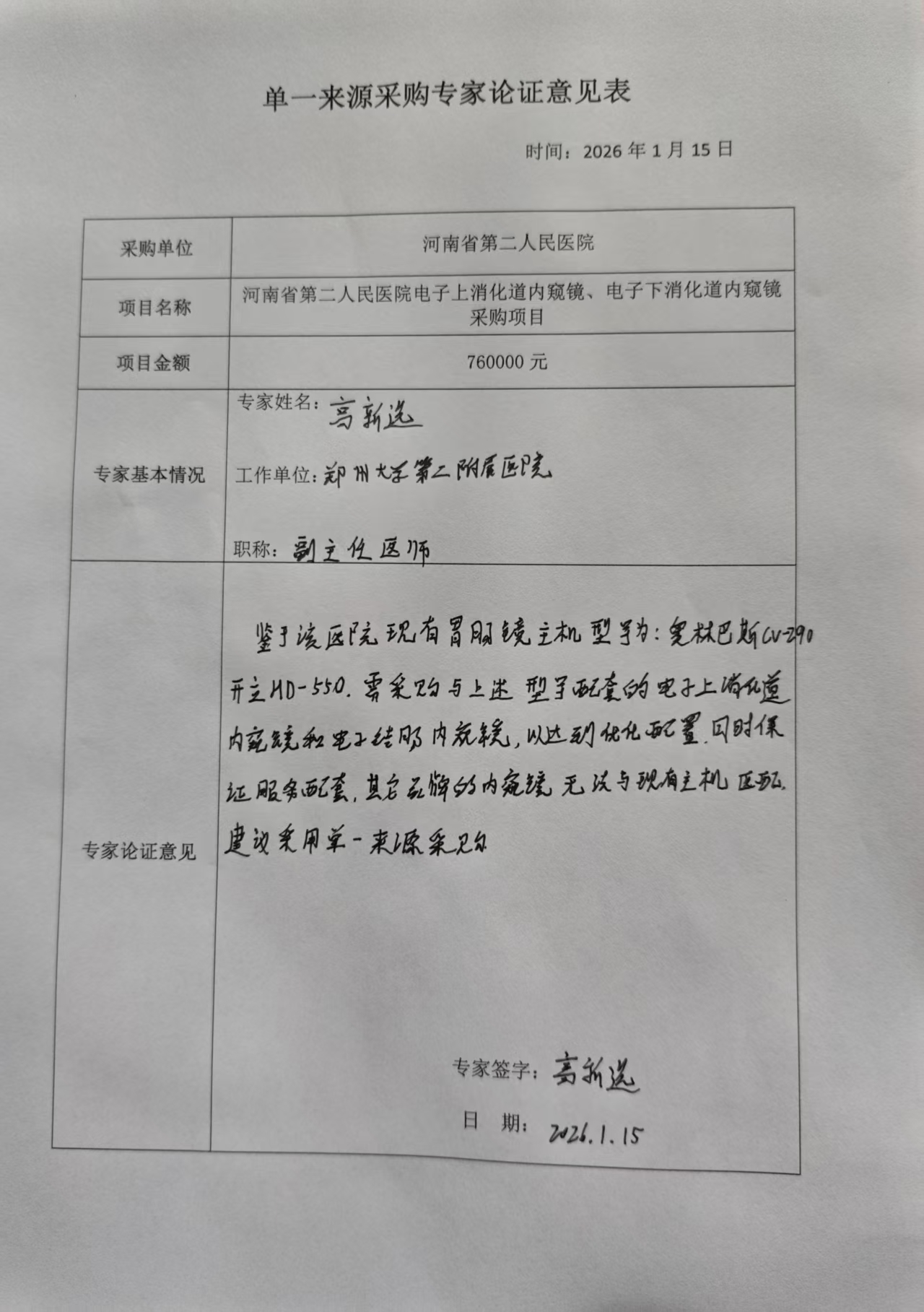 河南省第二人民医院电子上消化道内窥镜、电子下消化道内窥镜采购项目单一来源采购公示