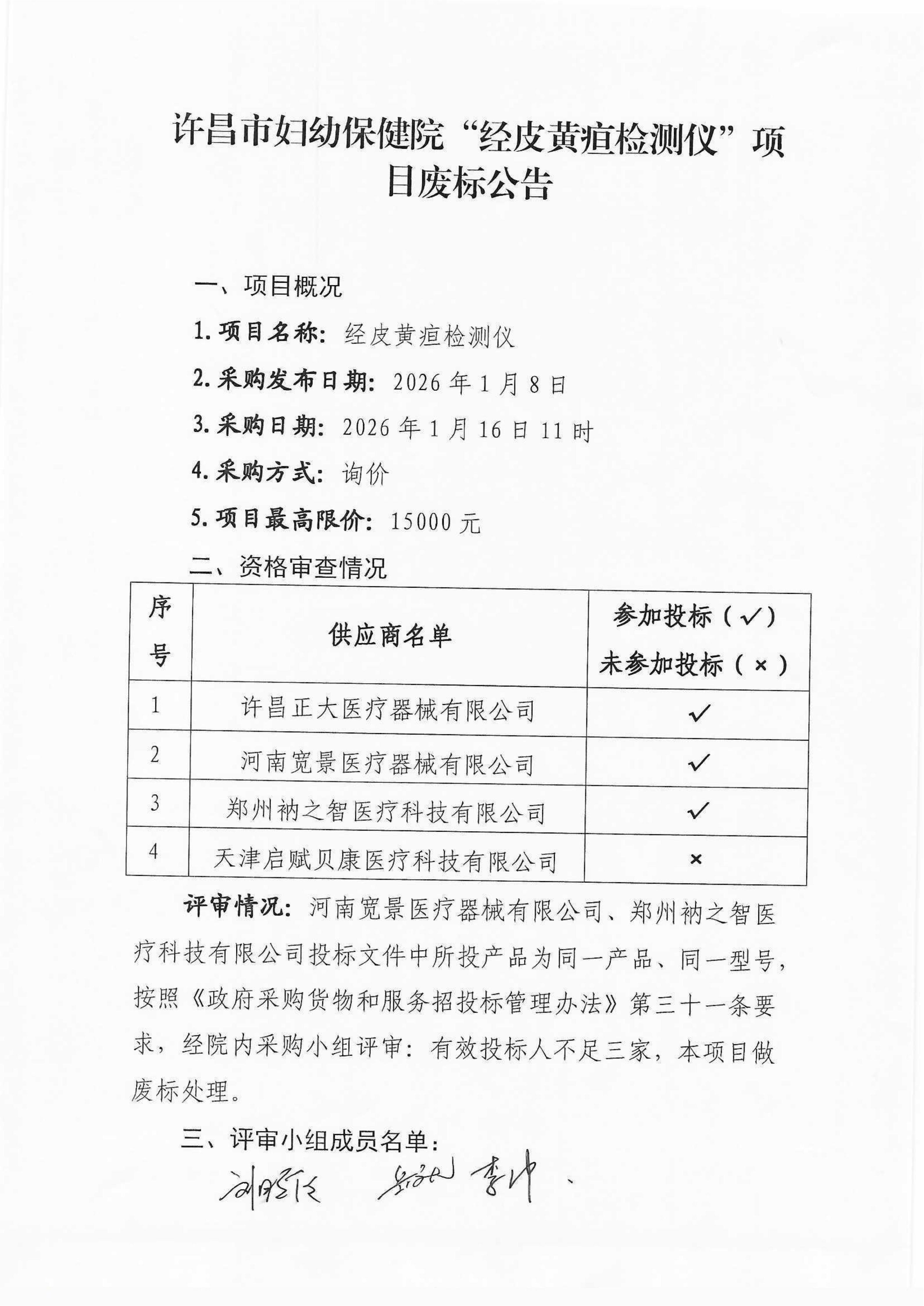 许昌市妇幼保健院“经皮黄疸检测仪”项目废标公告