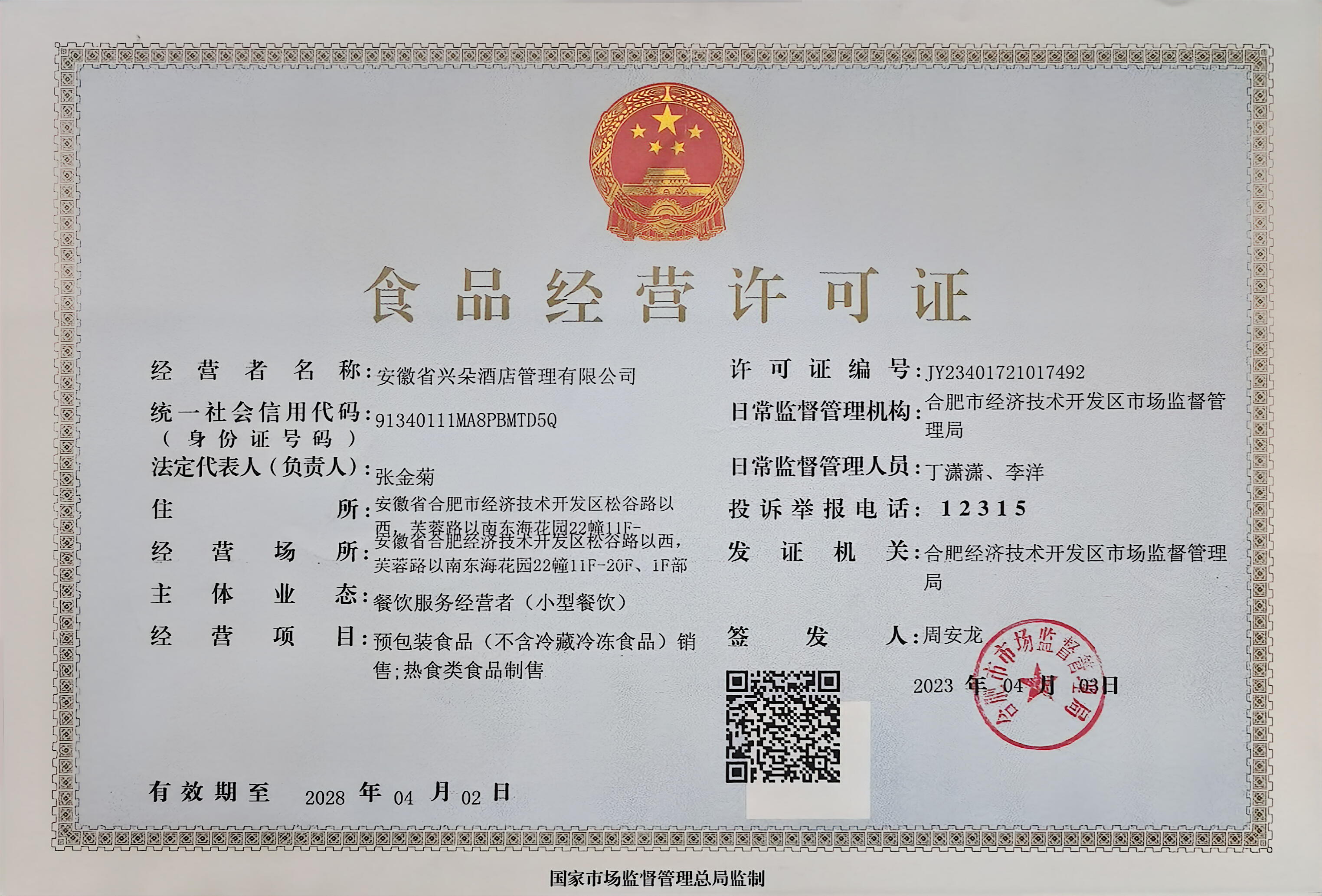 营业场所:安徽省合肥市经济技术开发区芙蓉路与松谷路交口