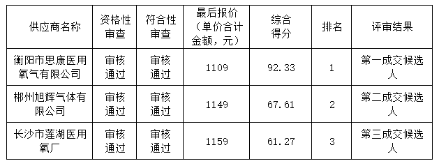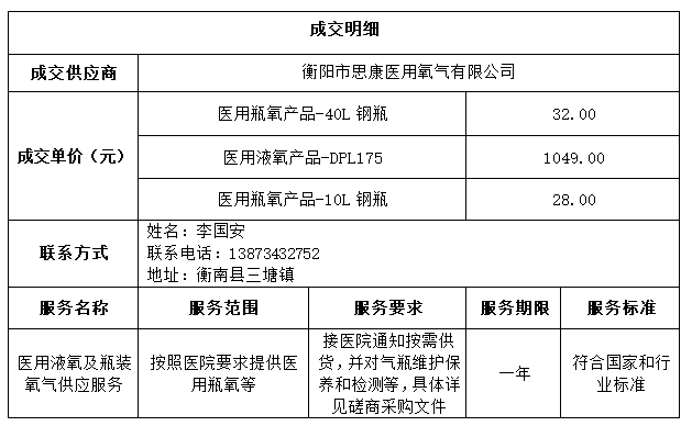 衡阳市妇幼保健院****年医用液氧及瓶装氧气供应服务项目于****年*月**日结束,现将成交结果公告如下: