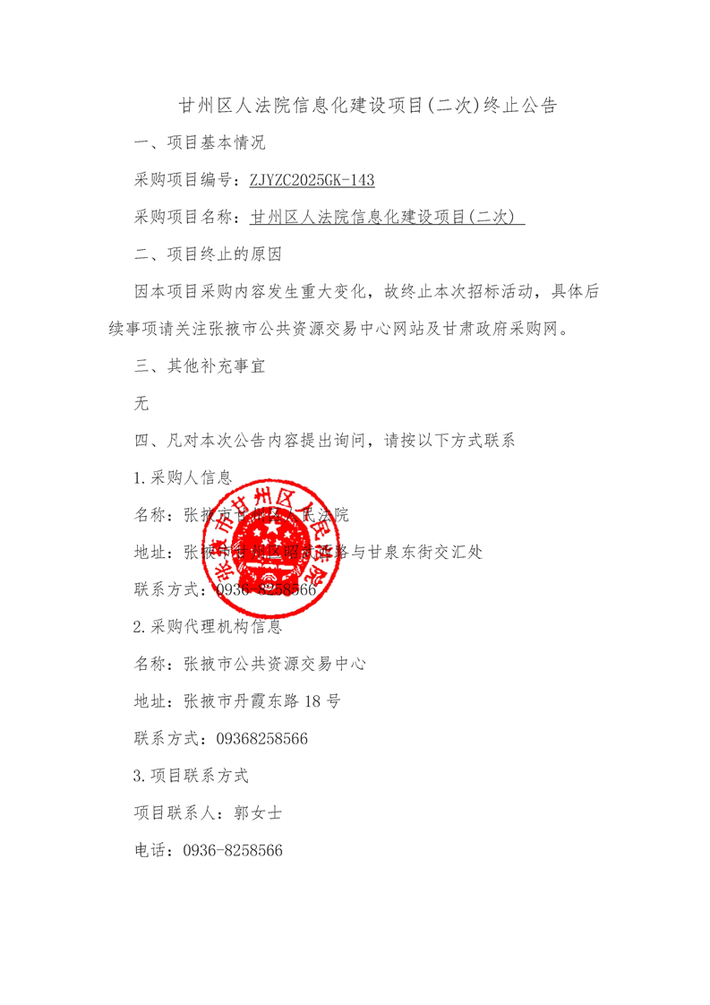 甘州区人法院信息化建设项目(二次)终止公告{type}