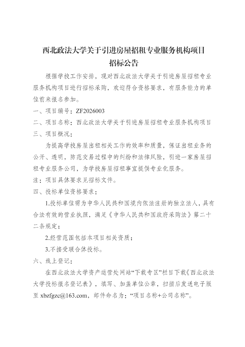 西北政法大学关于引进房屋招租专业服务机构项目招标公告