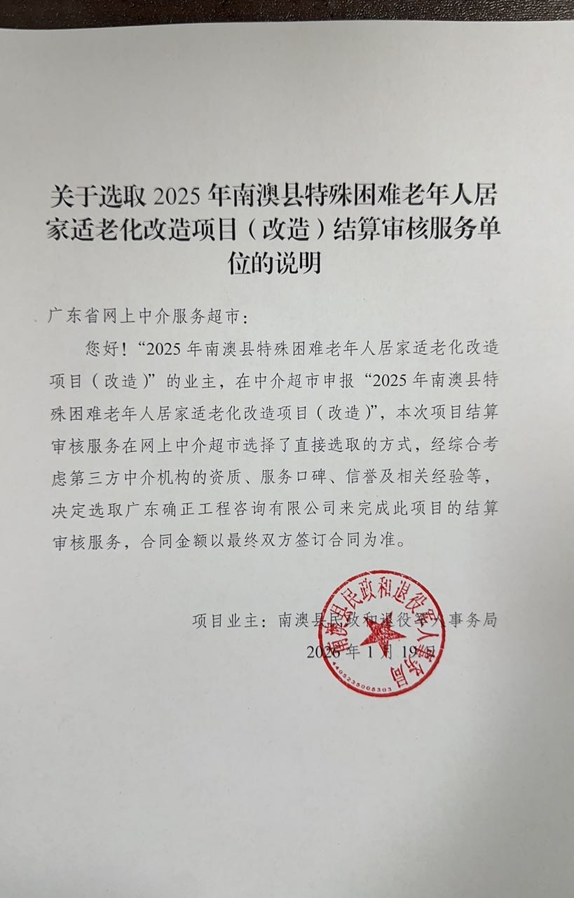 2025年南澳县特殊困难老年人居家适老化改造项目(改造)结算审核中选公示