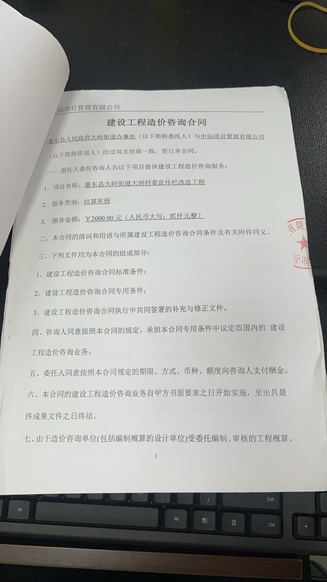 惠东县大岭街道大洲村委宣传栏改造工程结算审核