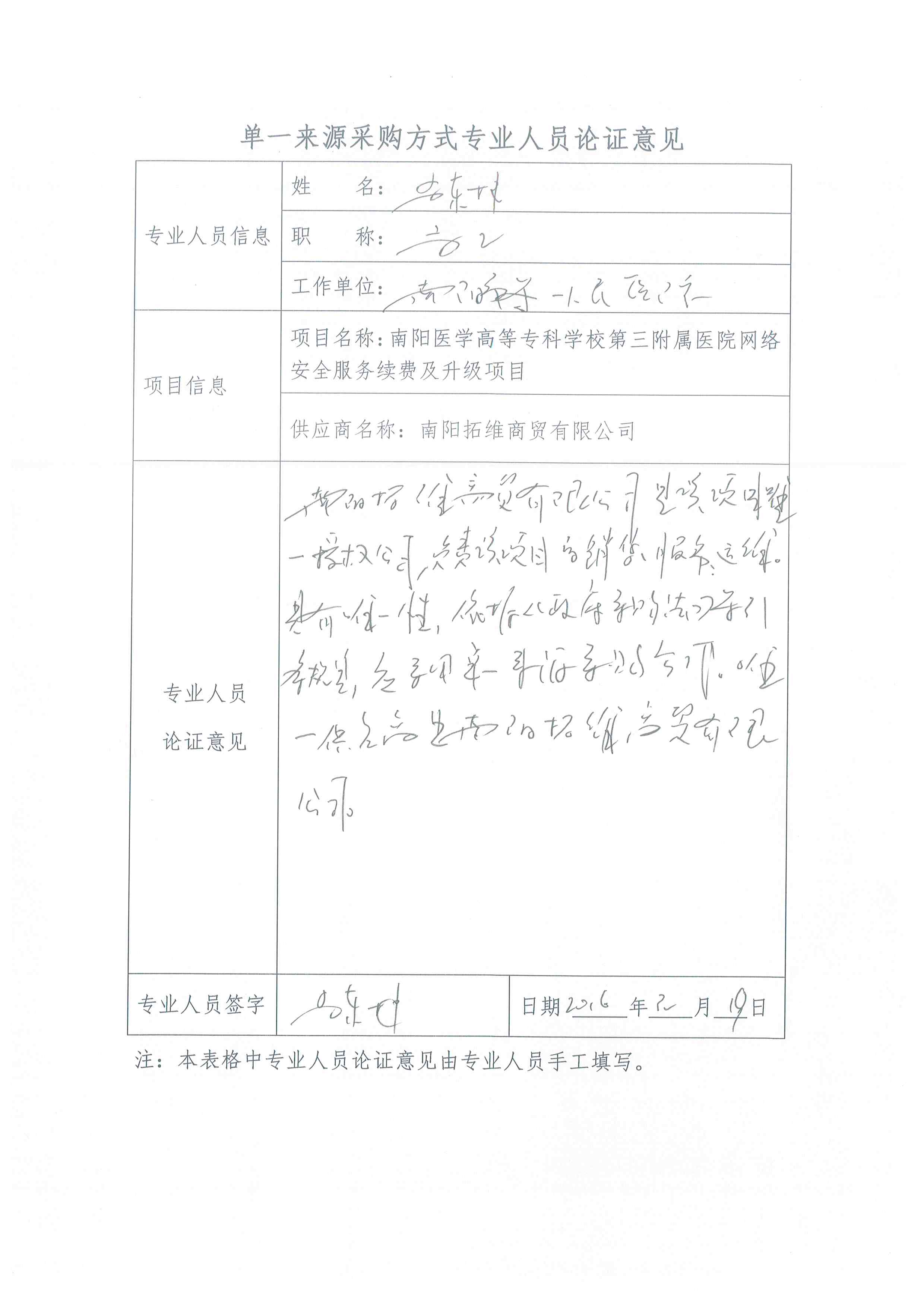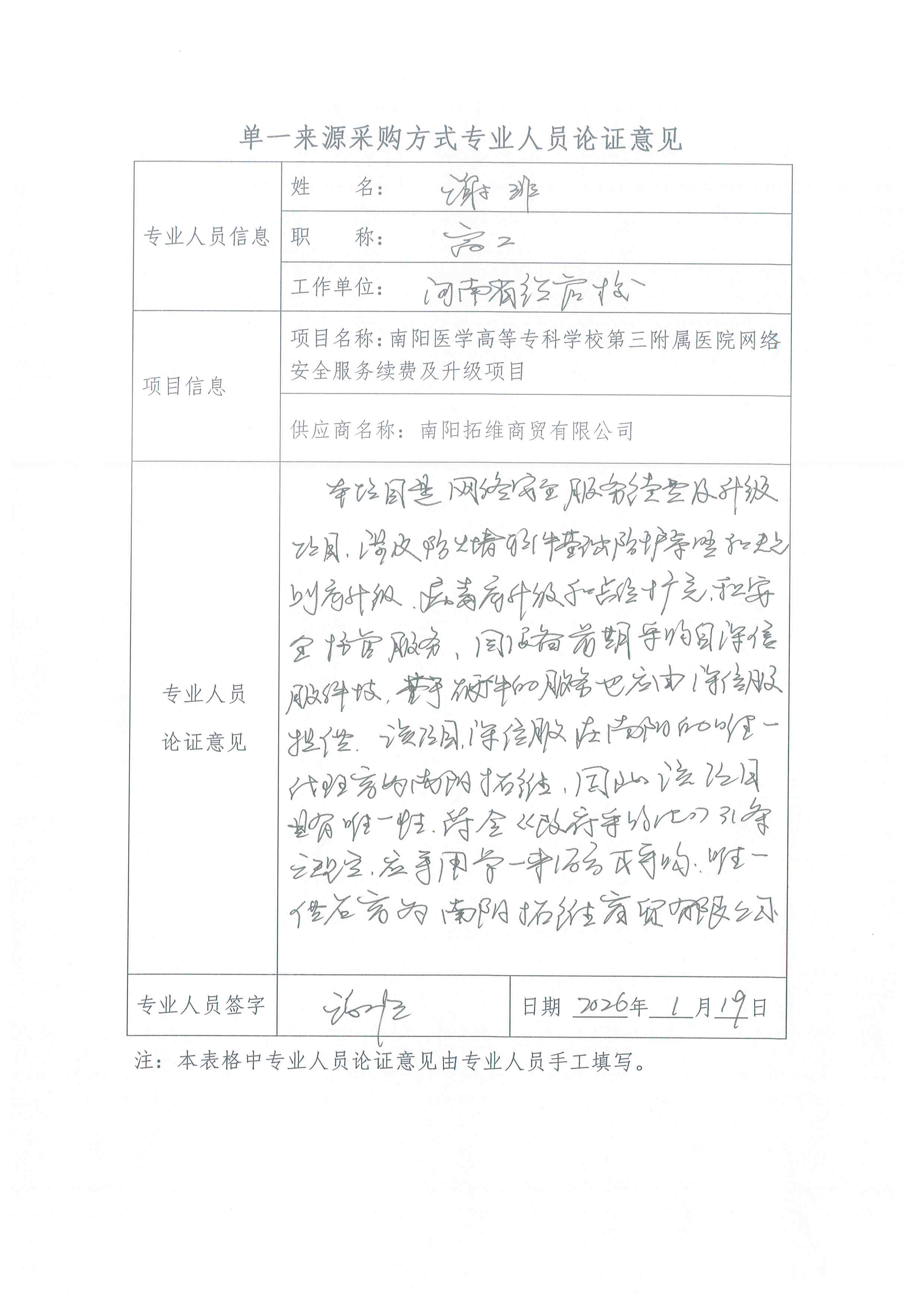 | 南阳医学高等专科学校第三附属医院网络安全体系于三年前由深信服科技股份有限公司承接。现原厂三年标准维保服务及部分安全订阅服务已到期,因采购标的(深信服品牌专用服务)受原厂知识产权保护,原厂不接受用户直接采购,也不会向南阳区域的其他经销商提供本项目所需的服务授权。南阳拓维商贸有限公司是深信服科技股份有限公司在本项目的唯一授权代理商。该情形符合《中华人民共和国政府采购法》第三十一条第(一)项规定的适用情形,具备采用单一来源采购方式的必要性与合法性。经专家论证,本项目符合单一来源采购条件。 | ||||||||||||||||