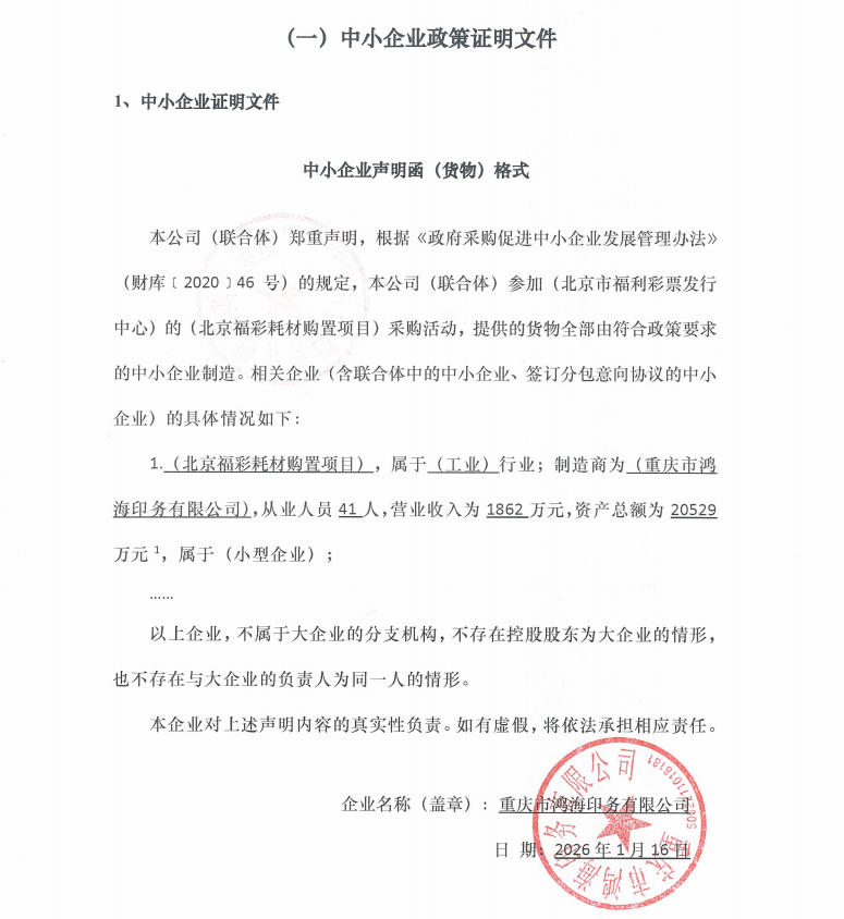 | 重庆市鸿海印务有限公司 | 北京福彩耗材购置项目 | 详见公告 | ***.* | 详见招标文件 |
