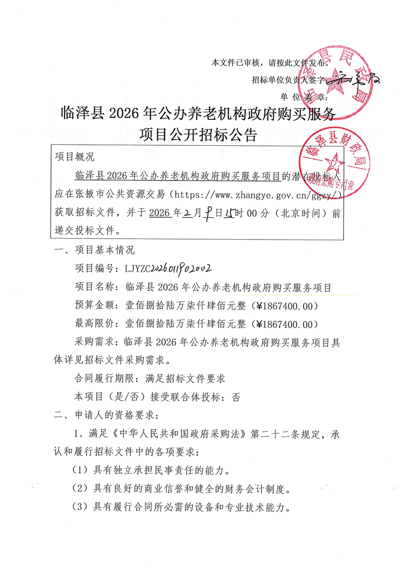临泽县2026年公办养老机构政府购买服务项目公开招标公告采购/资审公告