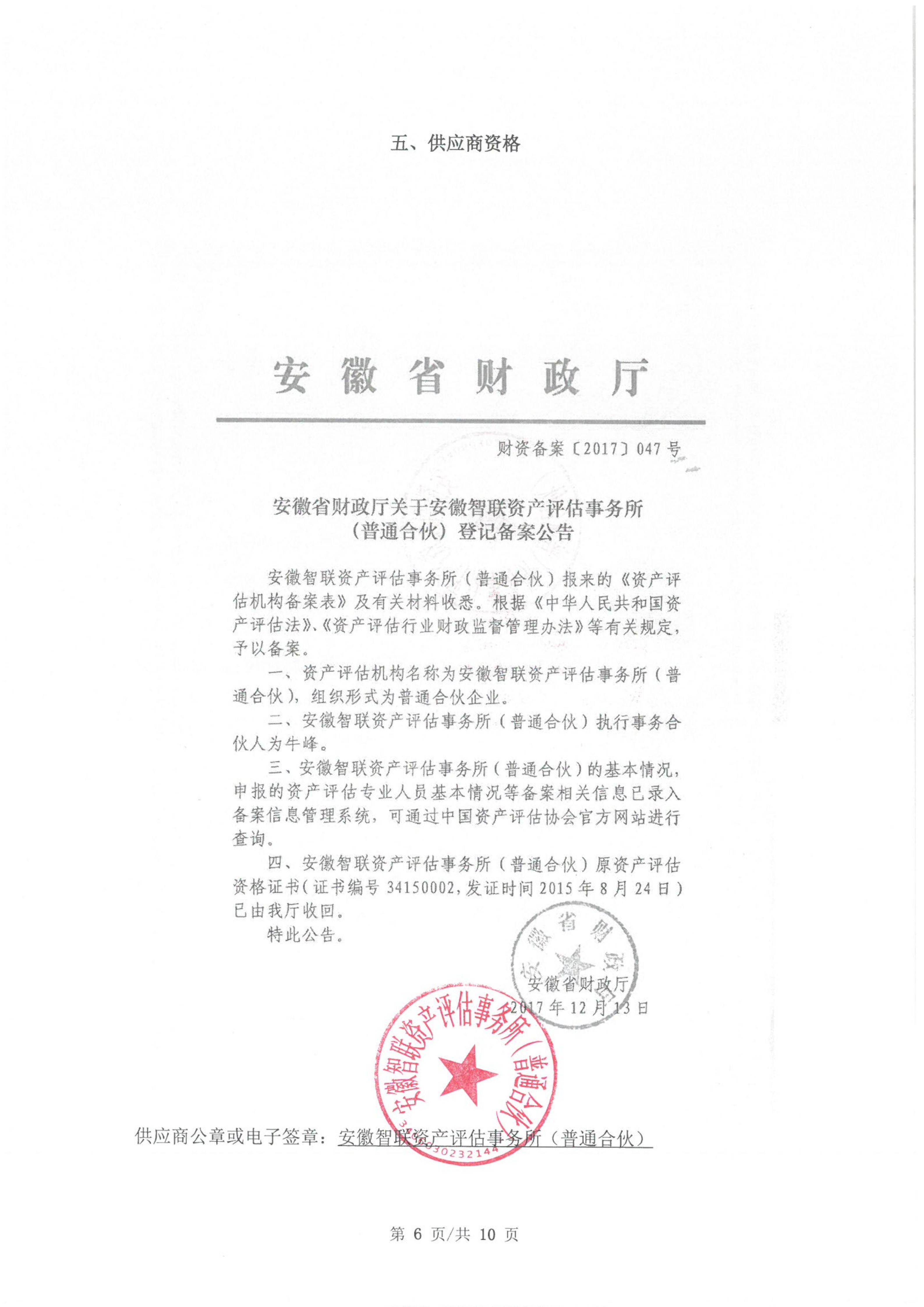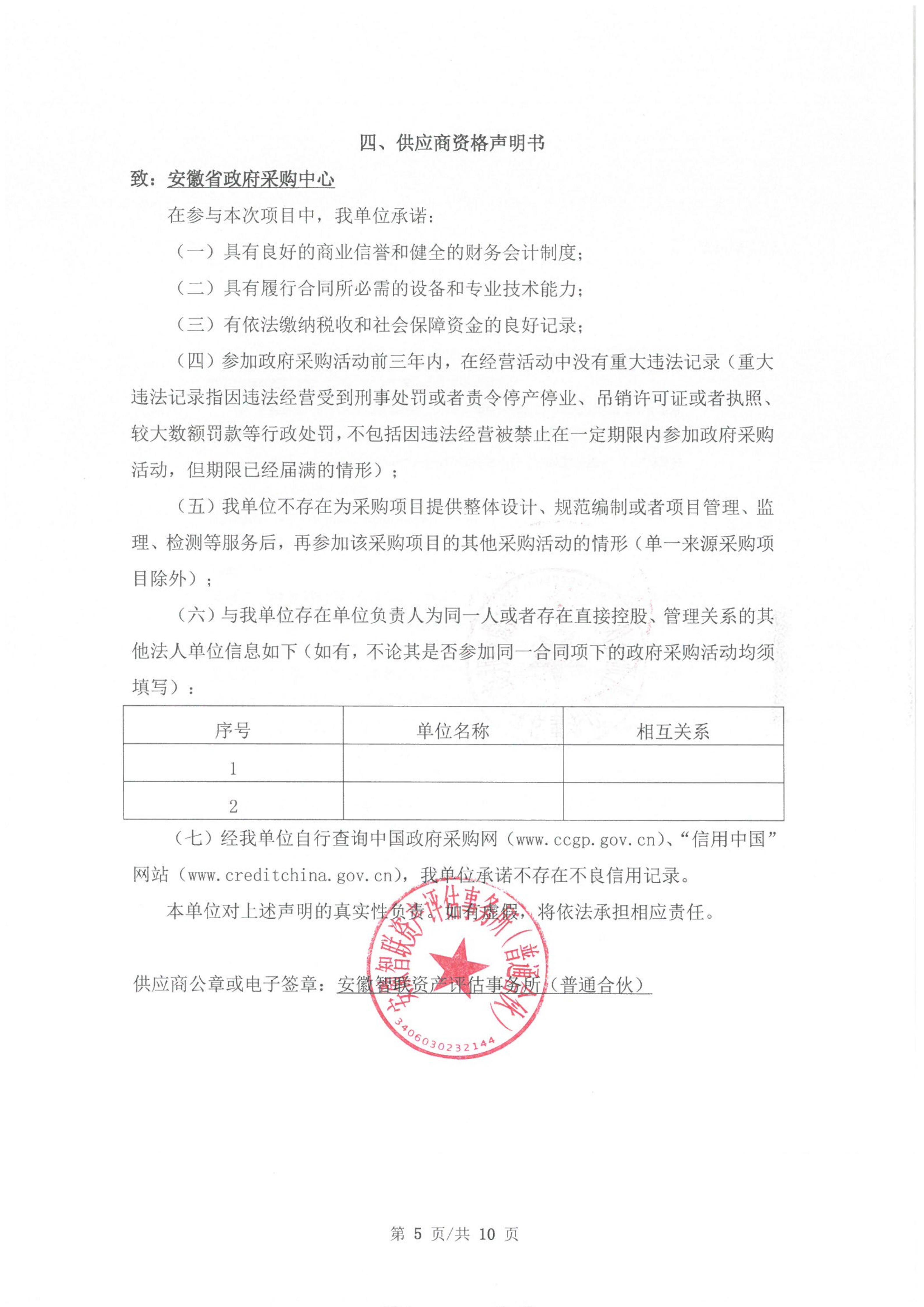 供应商资格声明书:安徽智联资产评估事务所征集资料及其他要求***.***