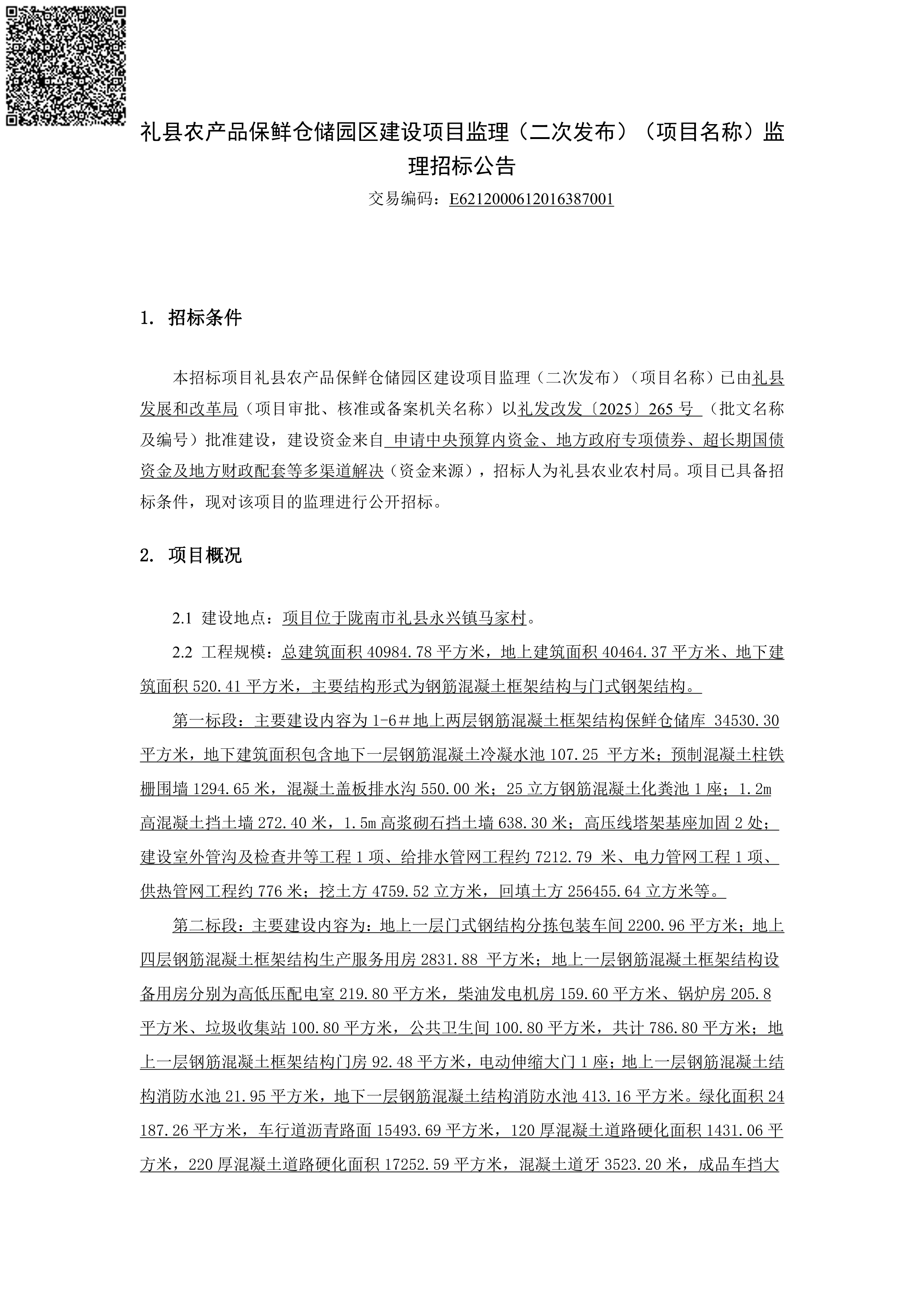 礼县农产品保鲜仓储园区建设项目监理(二次发布)