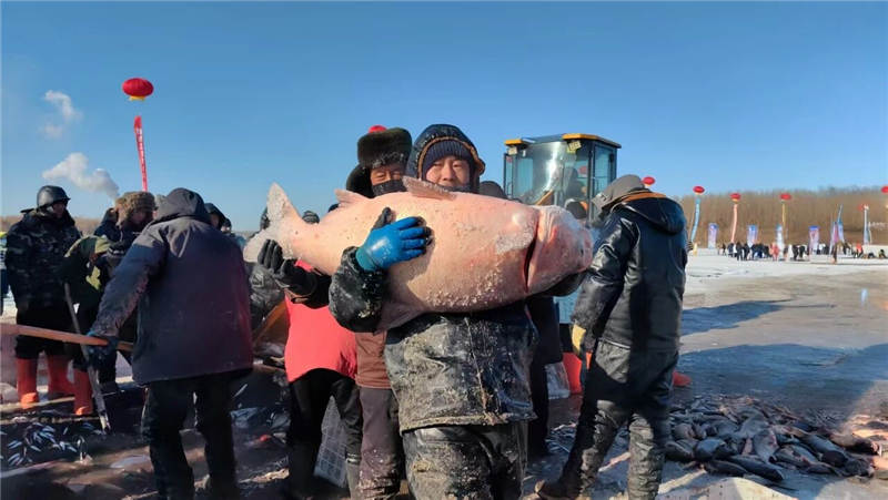 冬捕+市集激活水产品消费新引擎。大安水产品交易中心渔业大集同步开市,聚焦沉浸式渔猎文化体验+产业链科普+年货采购,现场设鲜鱼展示、分割、邮寄、酱料包配备等功能区域,提供一站式服务;头鱼拍卖现场更是热潮涌动,活动特别设置了月亮泡及玉龙湖冬捕双头鱼拍卖,既传承了渔猎文化、也打响了大安渔产名气,实现文旅引流、水产增收、富民共赢。