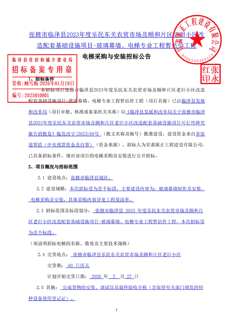 张掖市临泽县2023年度乐民东关农贸市场及颐和片区老旧小区改造配套基础设施项目-玻璃幕墙、电梯专业工程暂估价工程招标/资审公告
