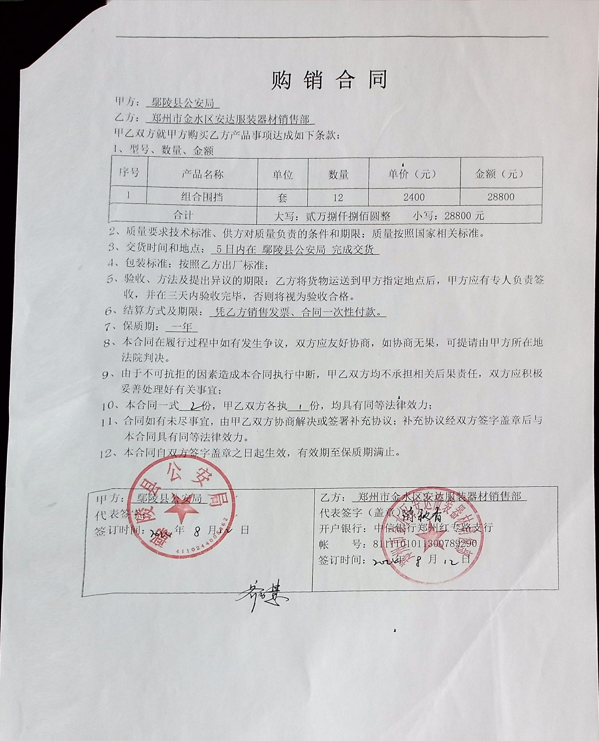 | 二、合同名称:鄢陵县公安局****年度政法装备采购警用围栏**套项目 | ||||||||||||