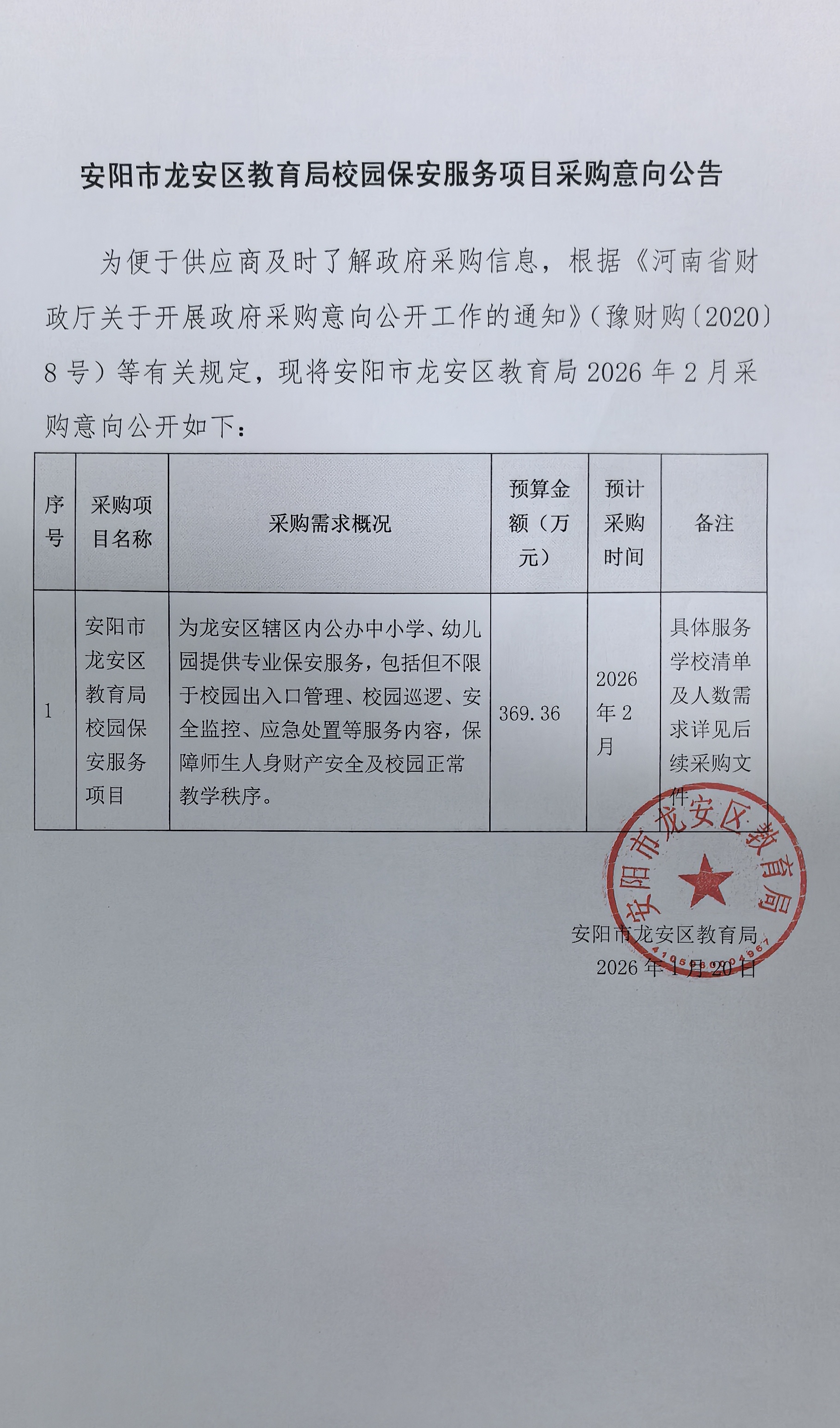 安阳市龙安区教育局2026年1至2月政府采购意向